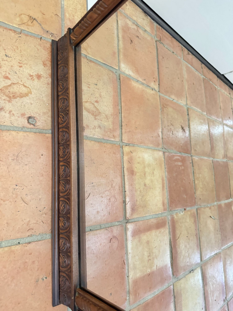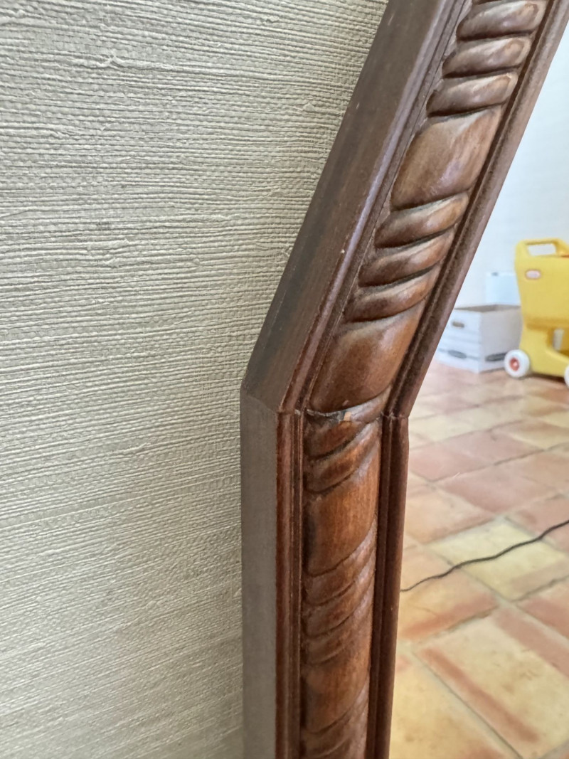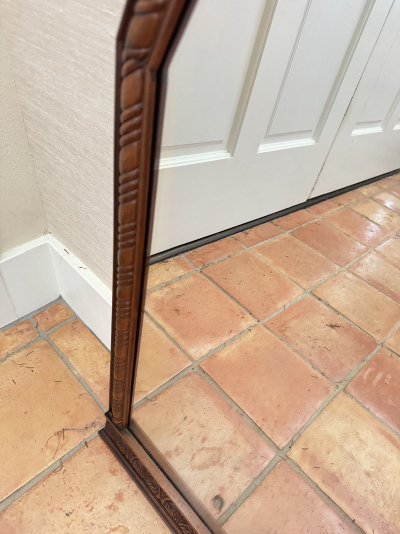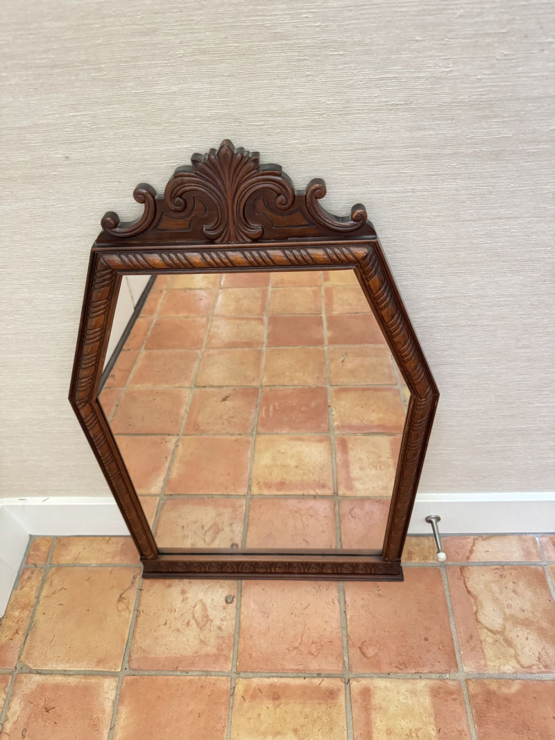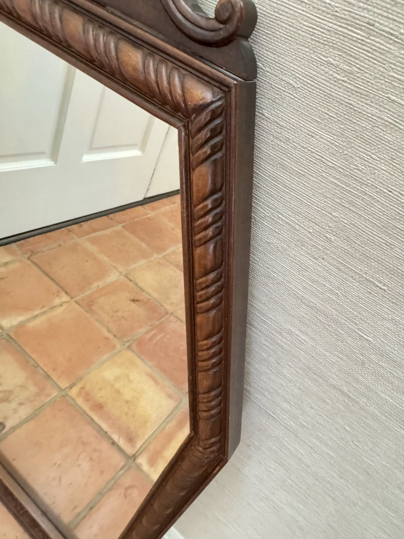 Vintage Ornate Carved Wood Wall Mirror w/ Decorative Crest Top Frame.