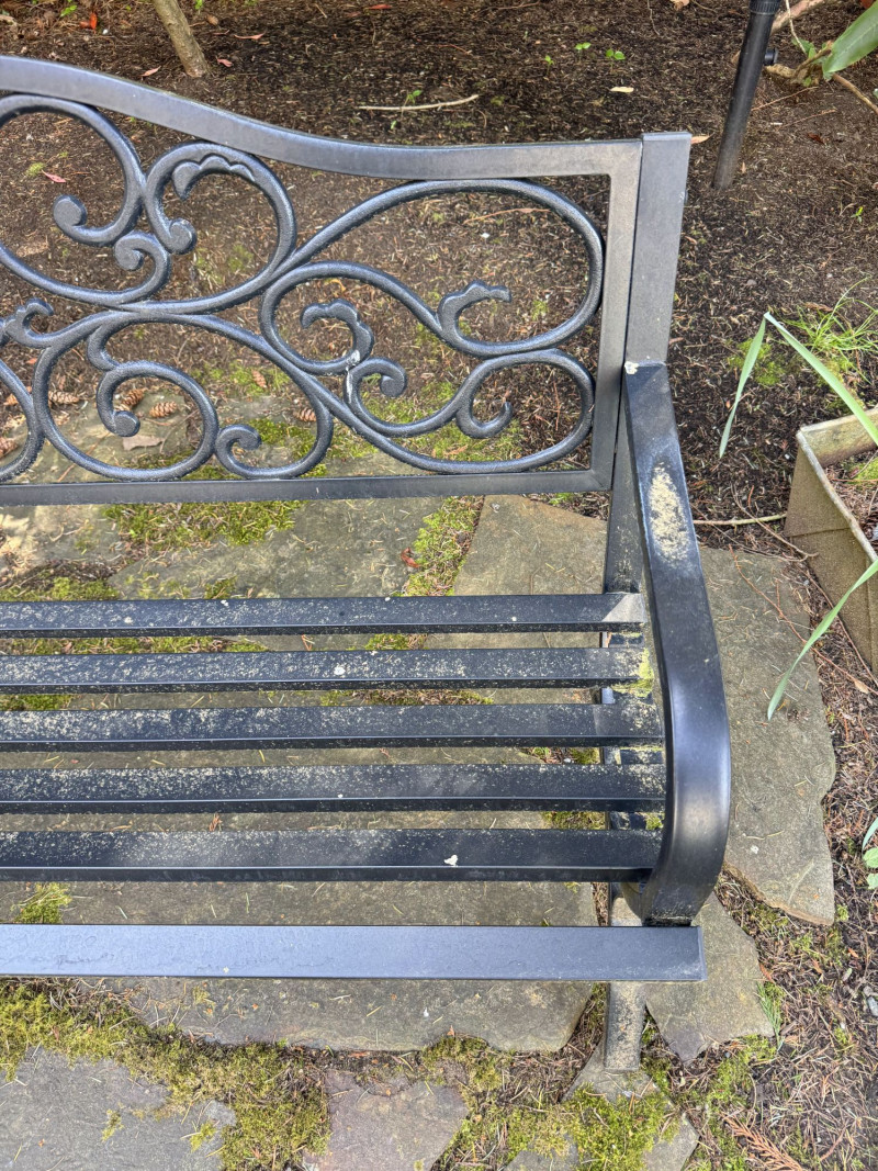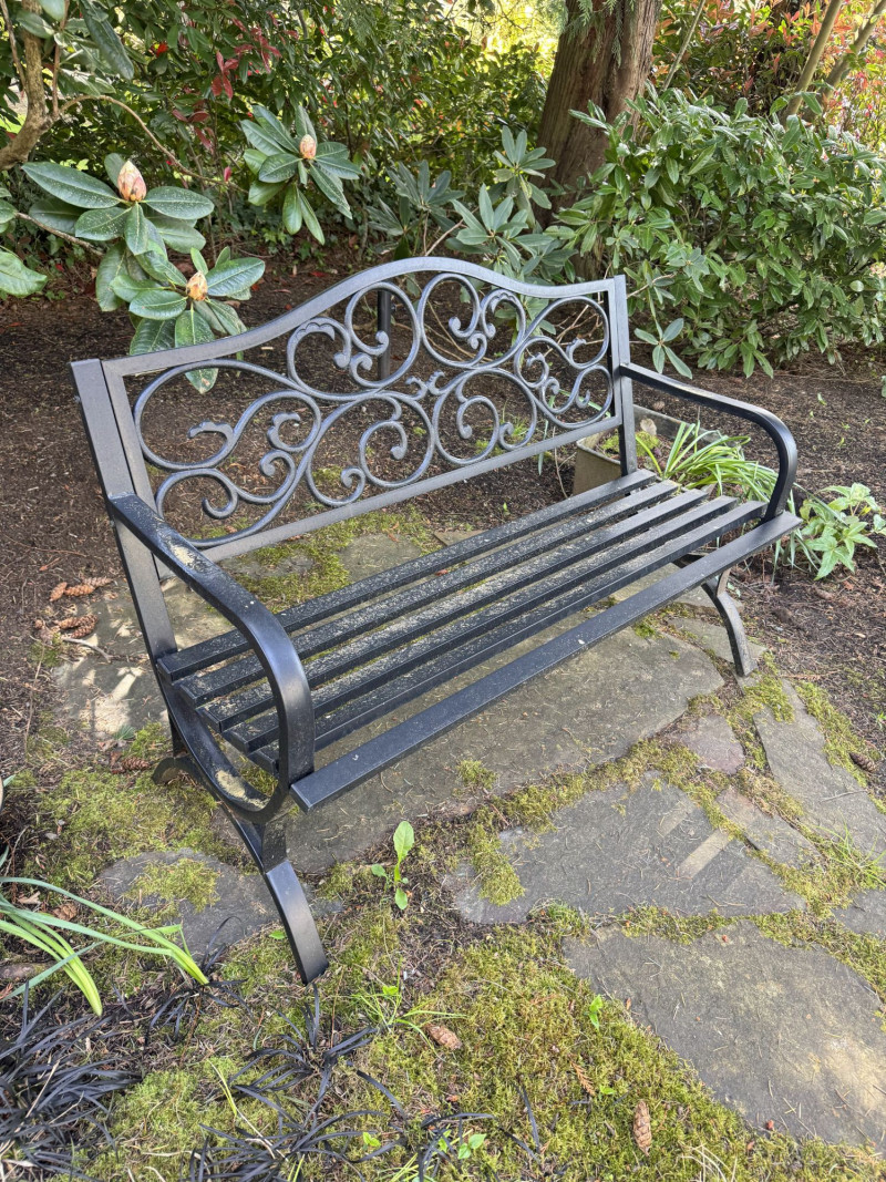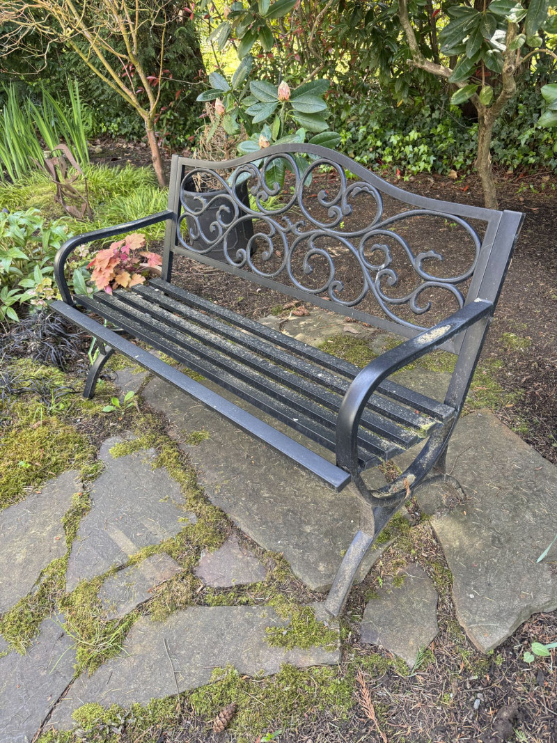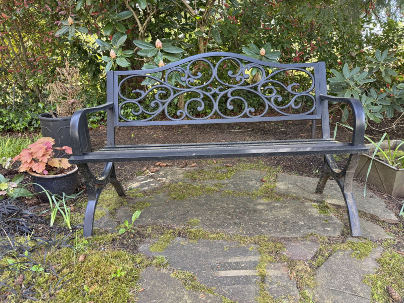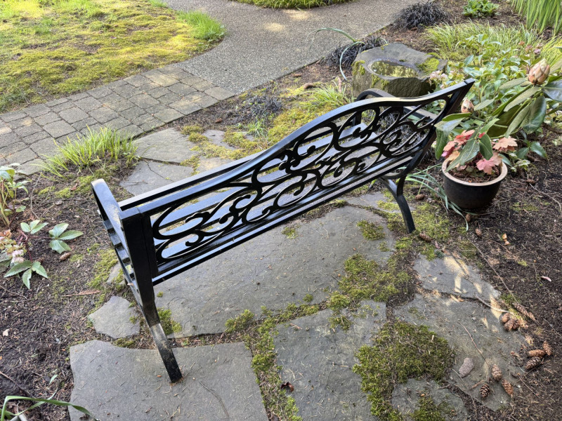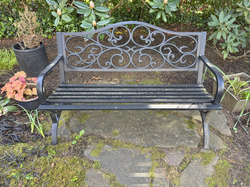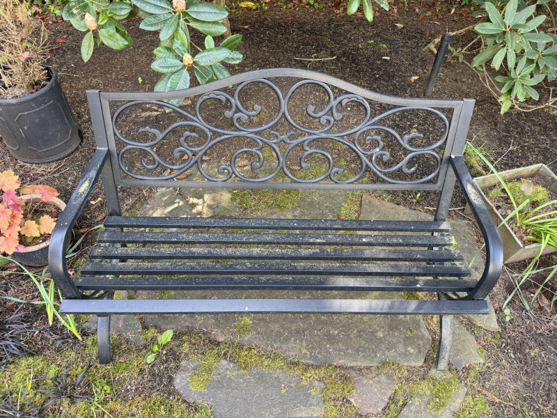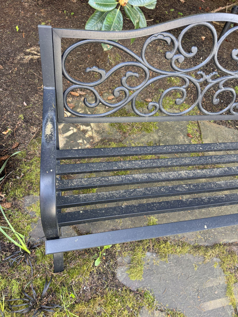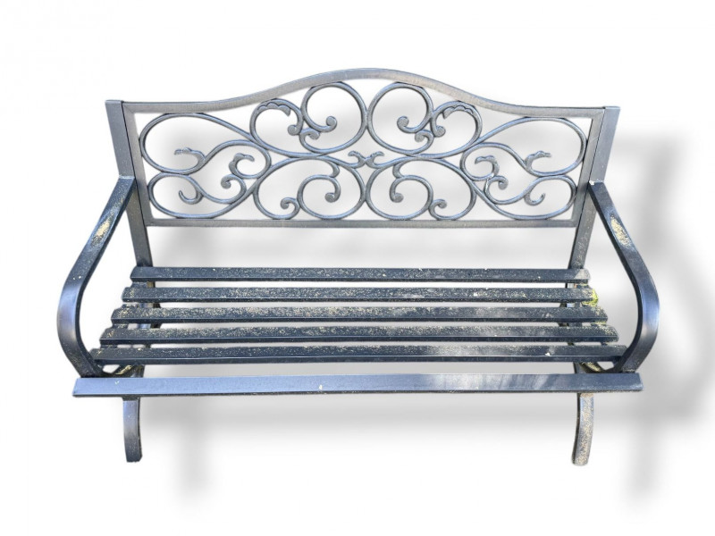 Wrought Iron Garden Bench w/ Ornate Scroll Design & Armrests.