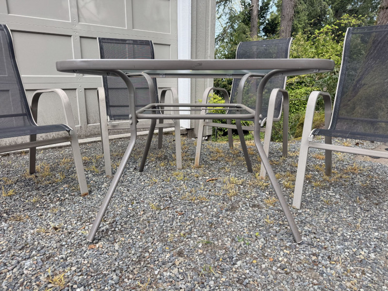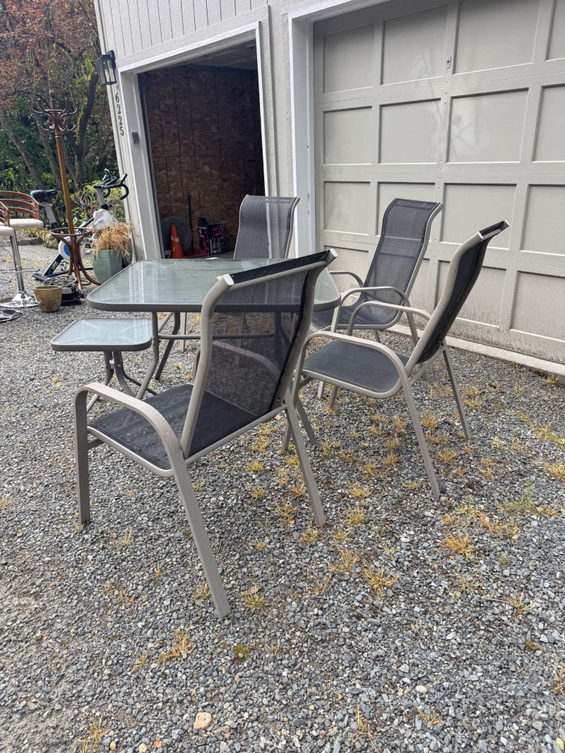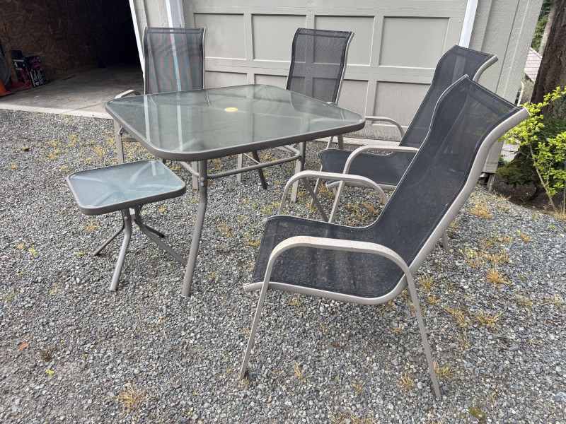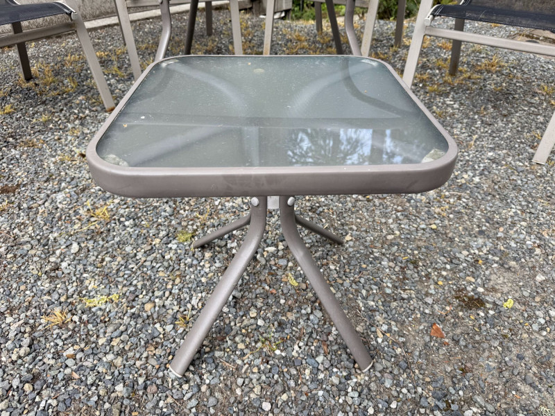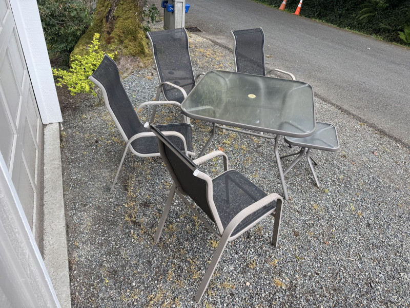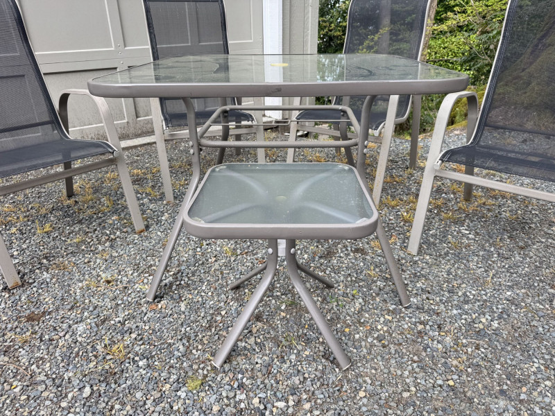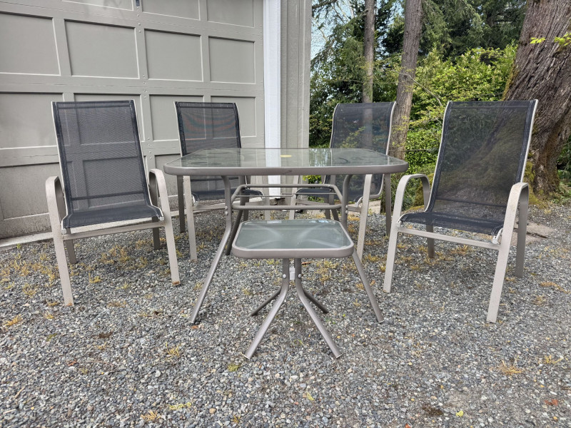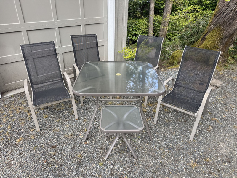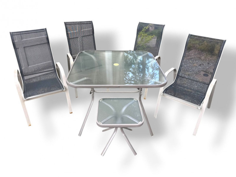 Outdoor Patio Dining Set - Glass Table, Four Chairs & Side Table.
