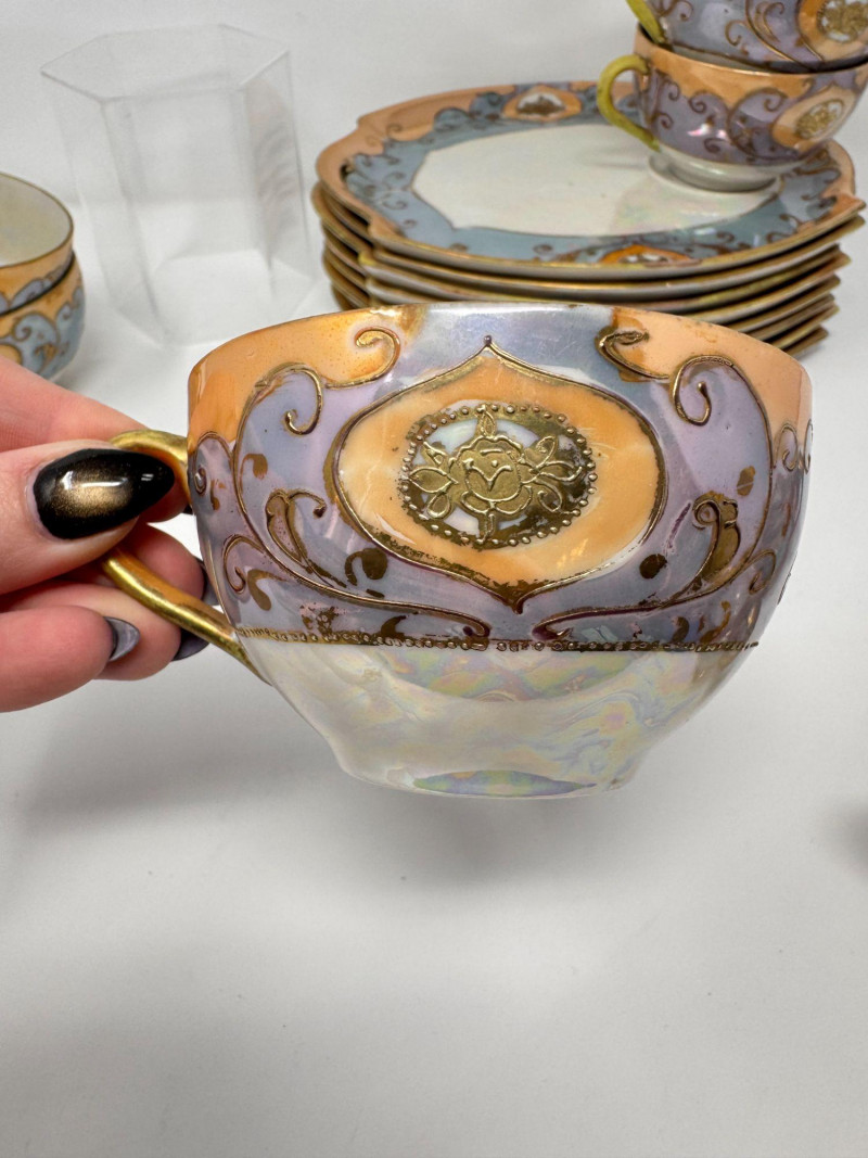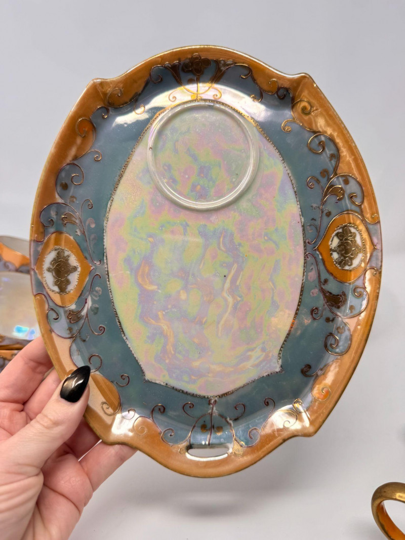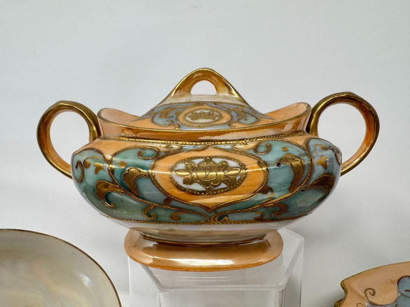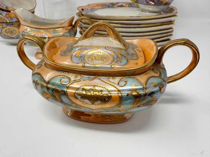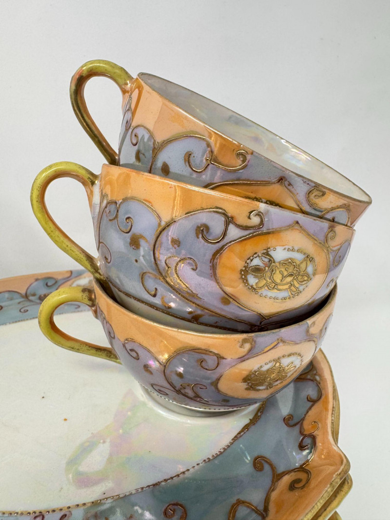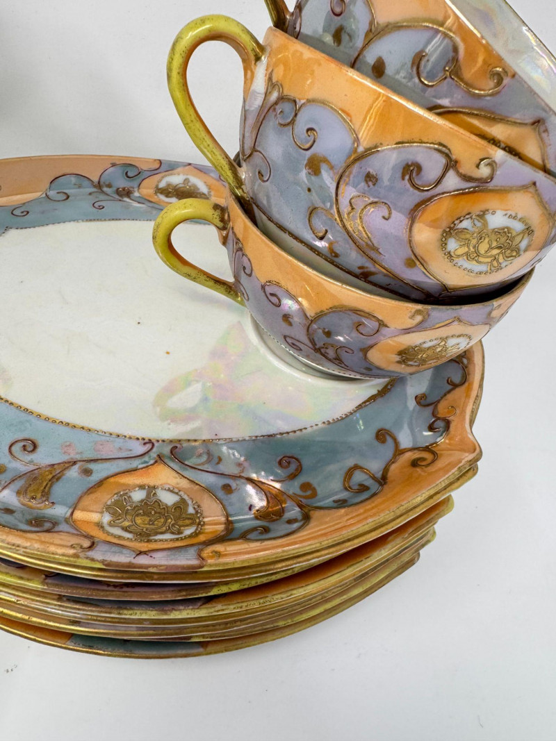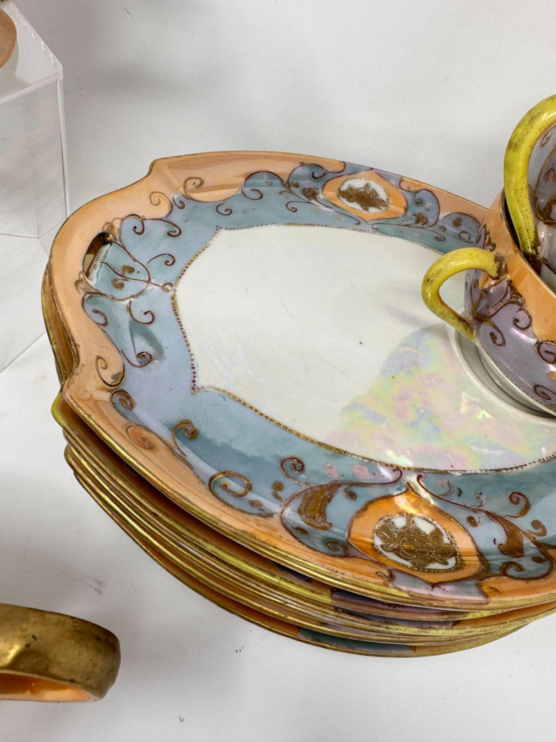 Antique Japanese Lusterware Tea Set - Snack Trays, Cups, Cream & Sugar. Includes: Condition: