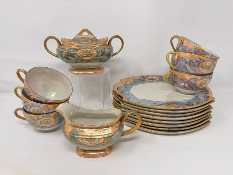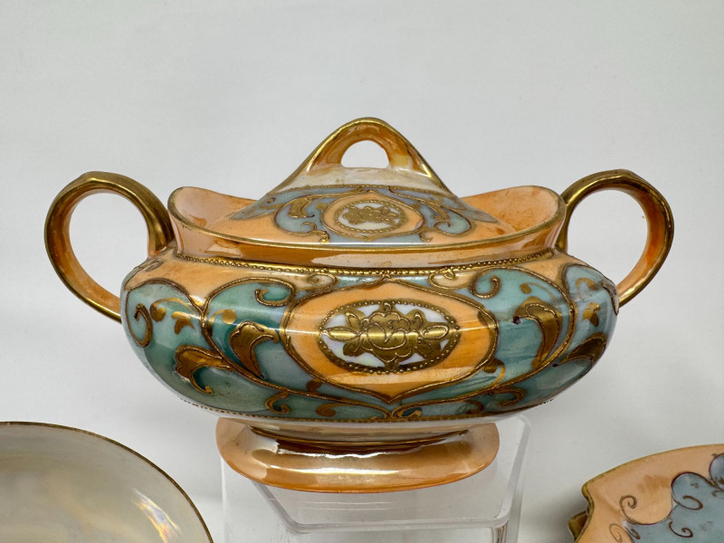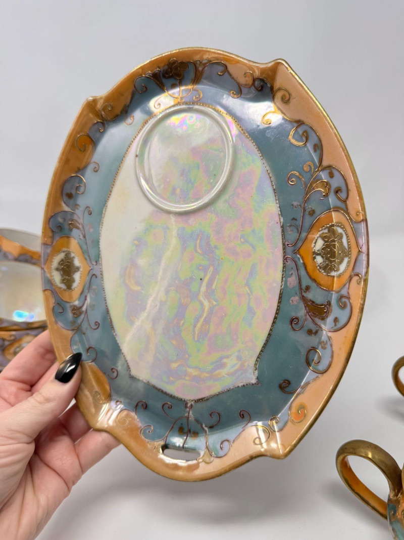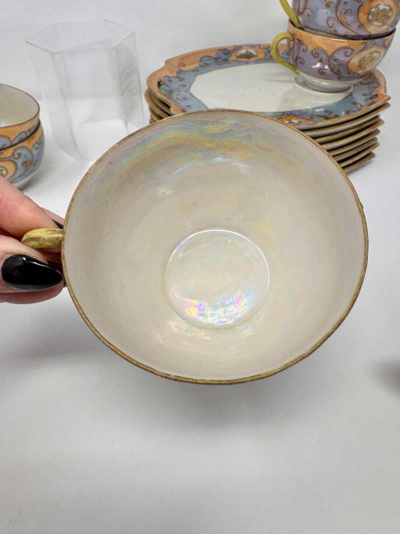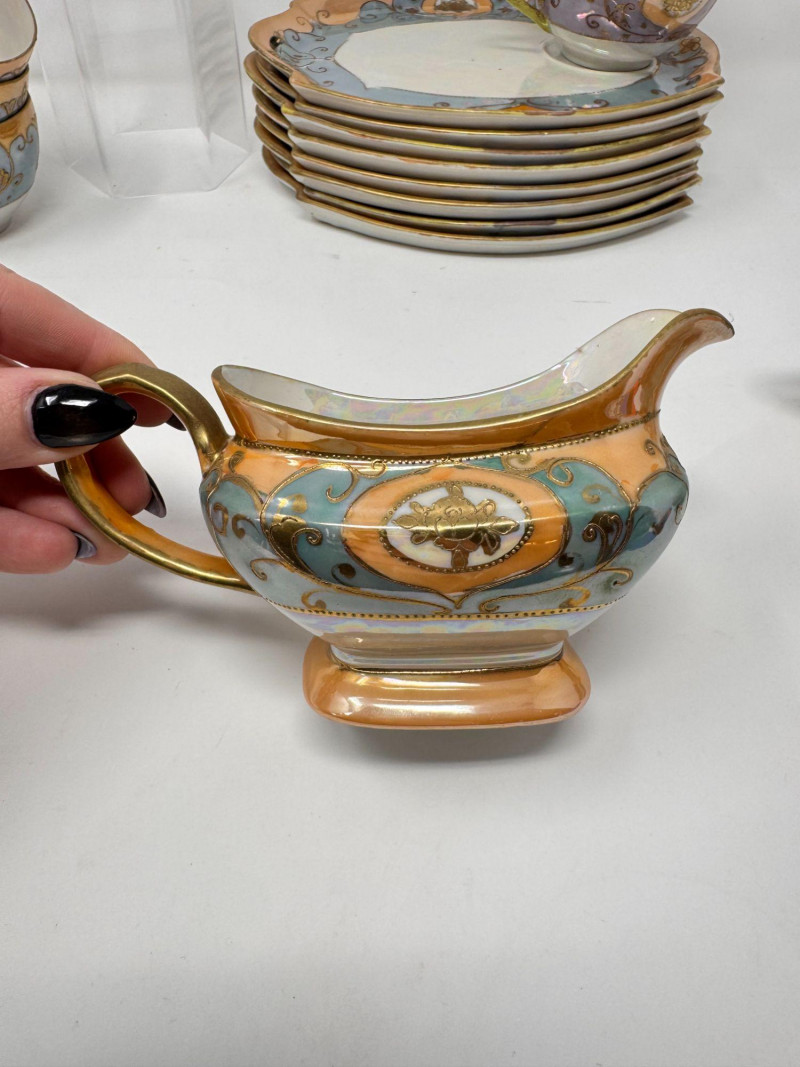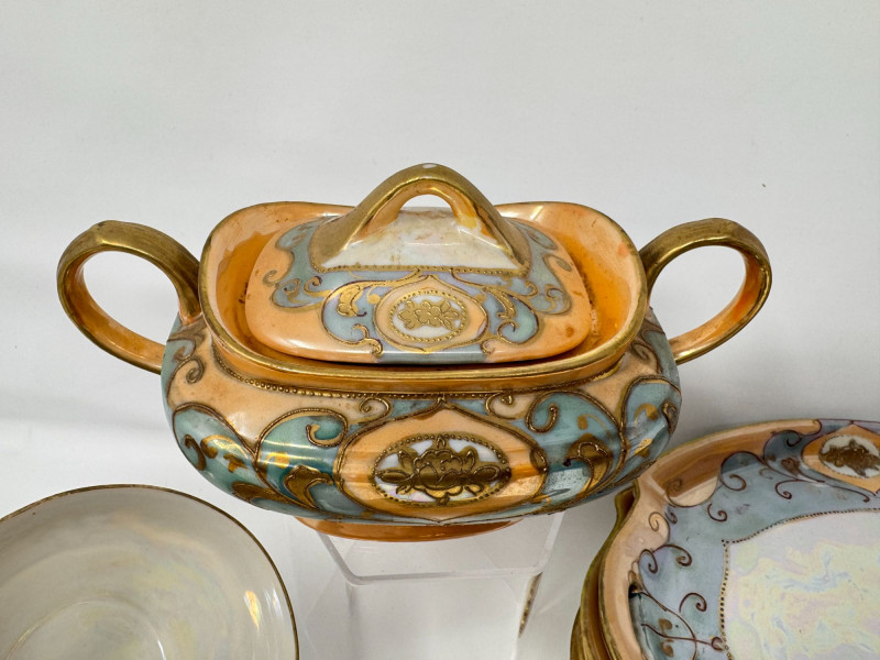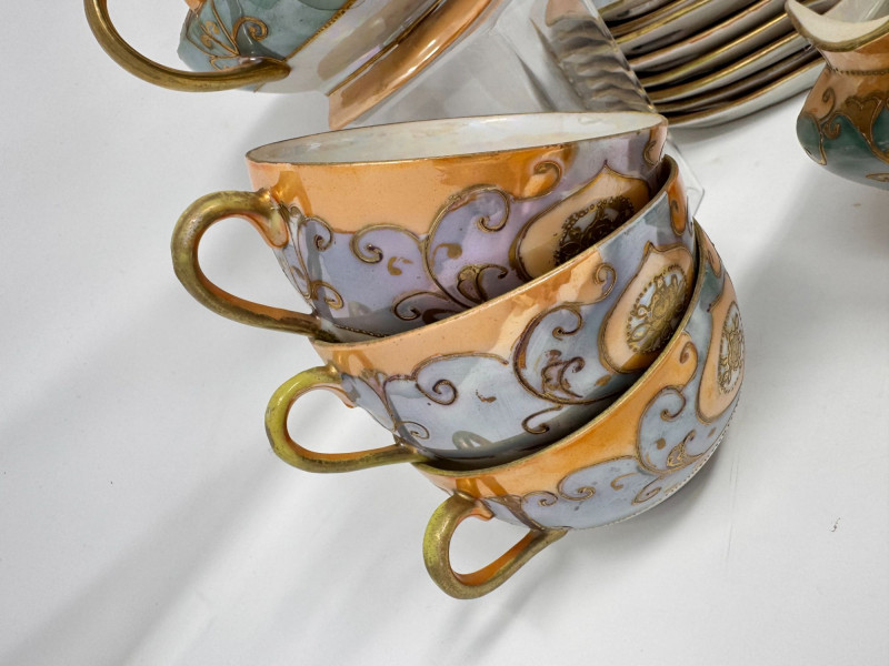 Antique Japanese Lusterware Tea Set - Snack Trays, Cups, Cream & Sugar. Includes: Condition: