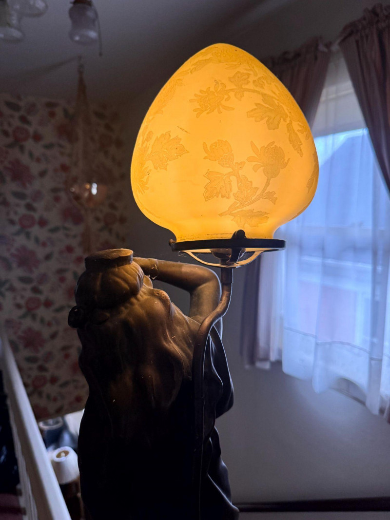 Art Deco Figural Woman Lamp w/ Yellow Glass Floral Shade.