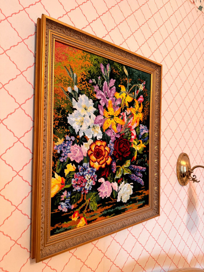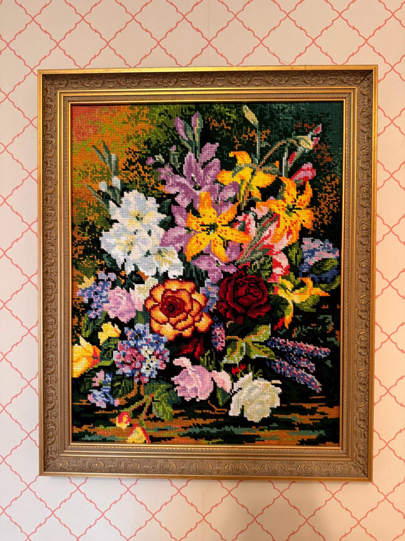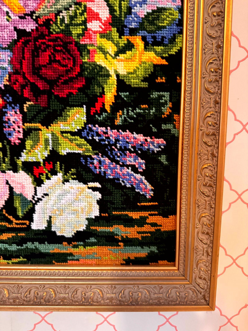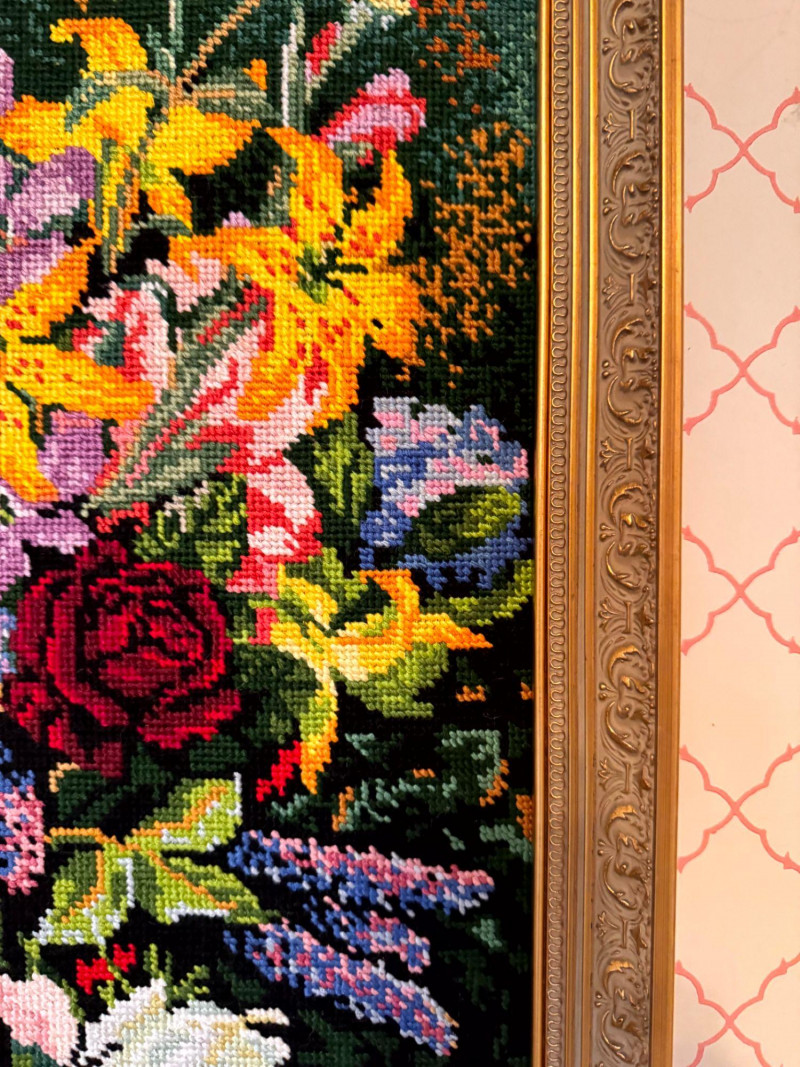 Vintage Floral Needlepoint Wall Art - Framed Bouquet.