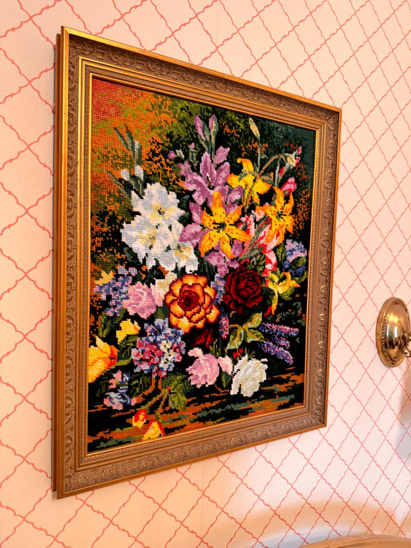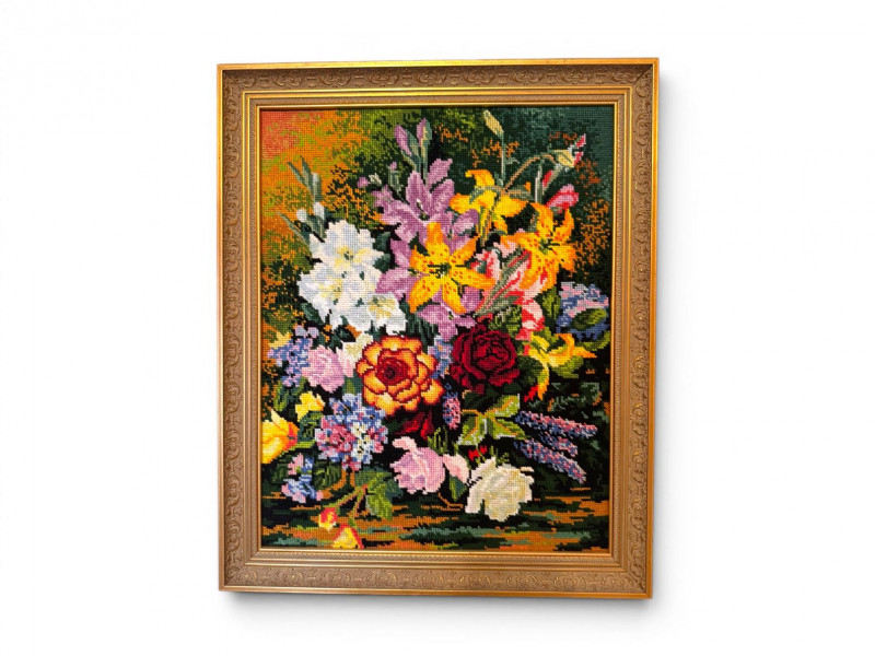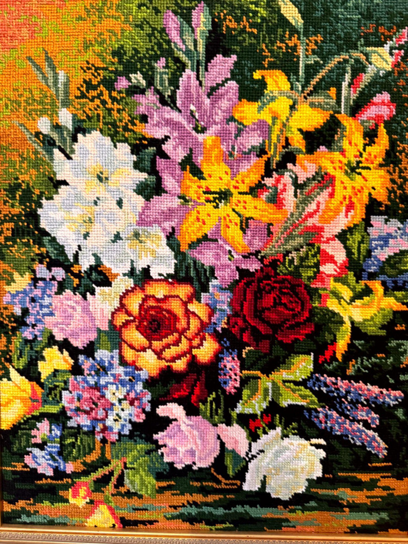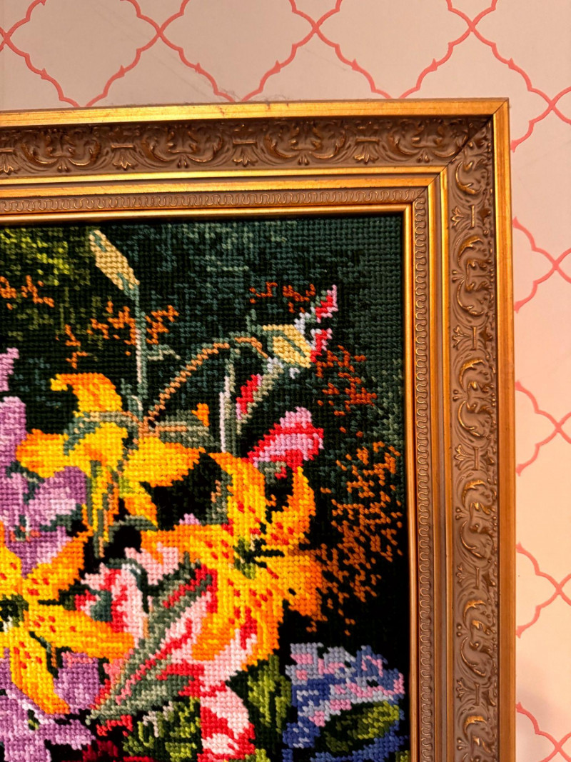 Vintage Floral Needlepoint Wall Art - Framed Bouquet.