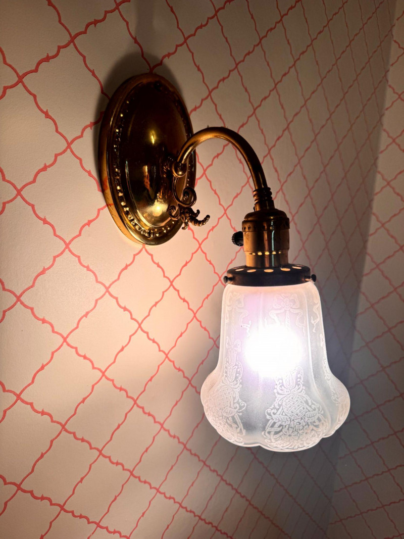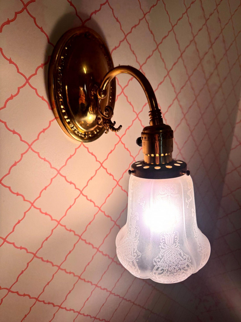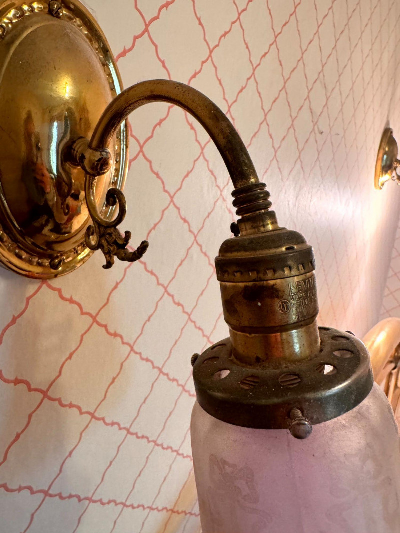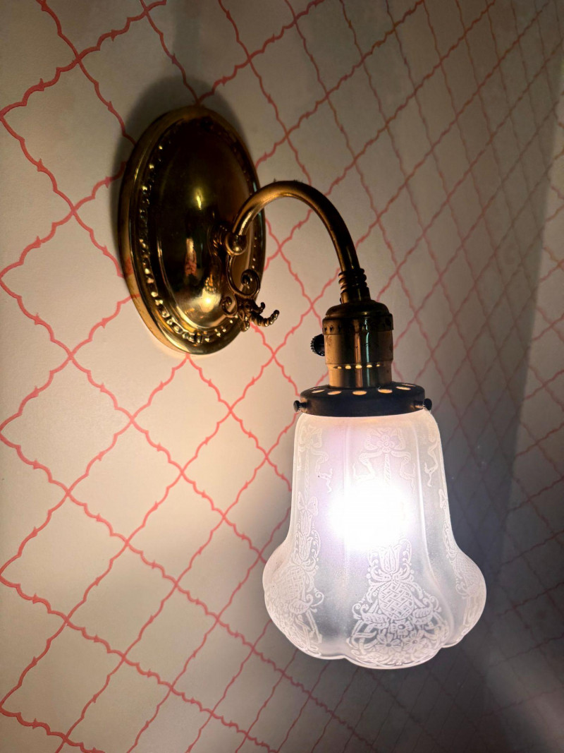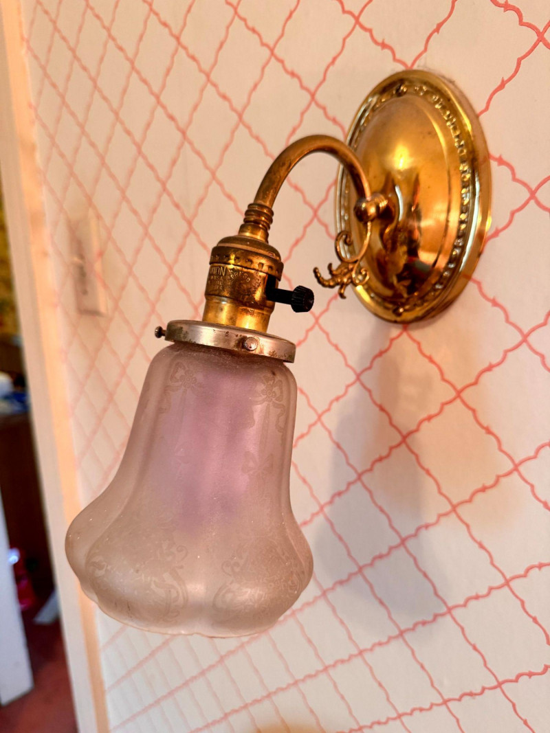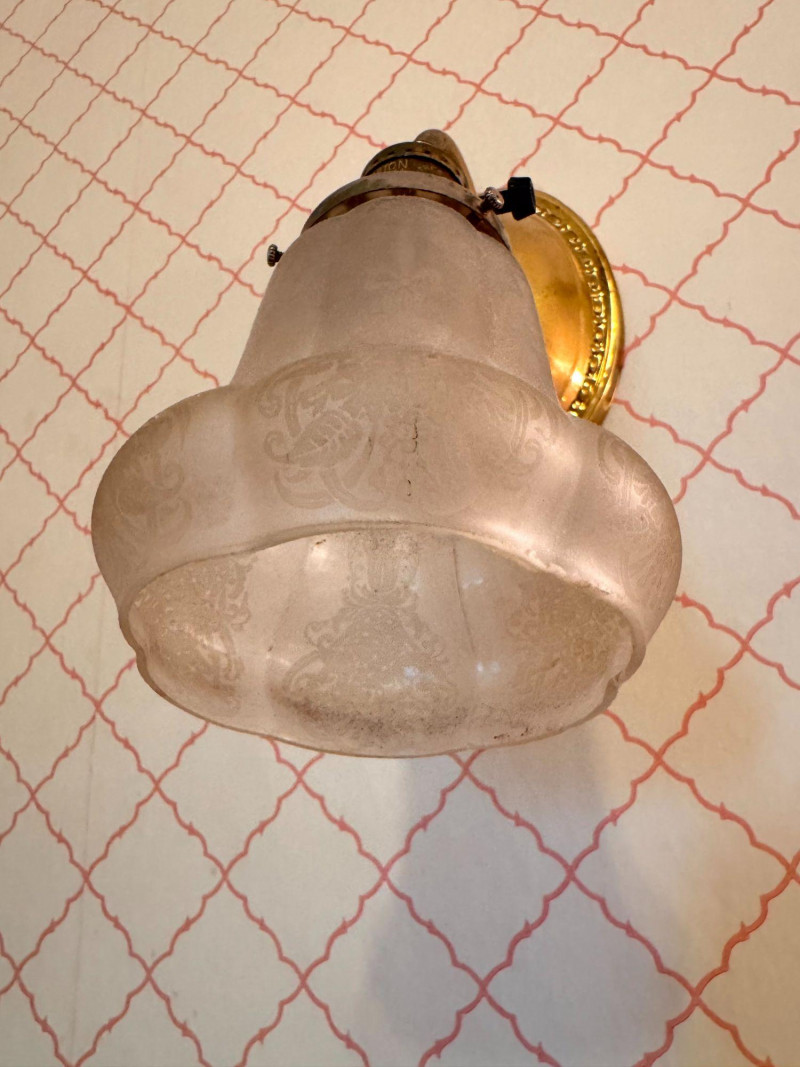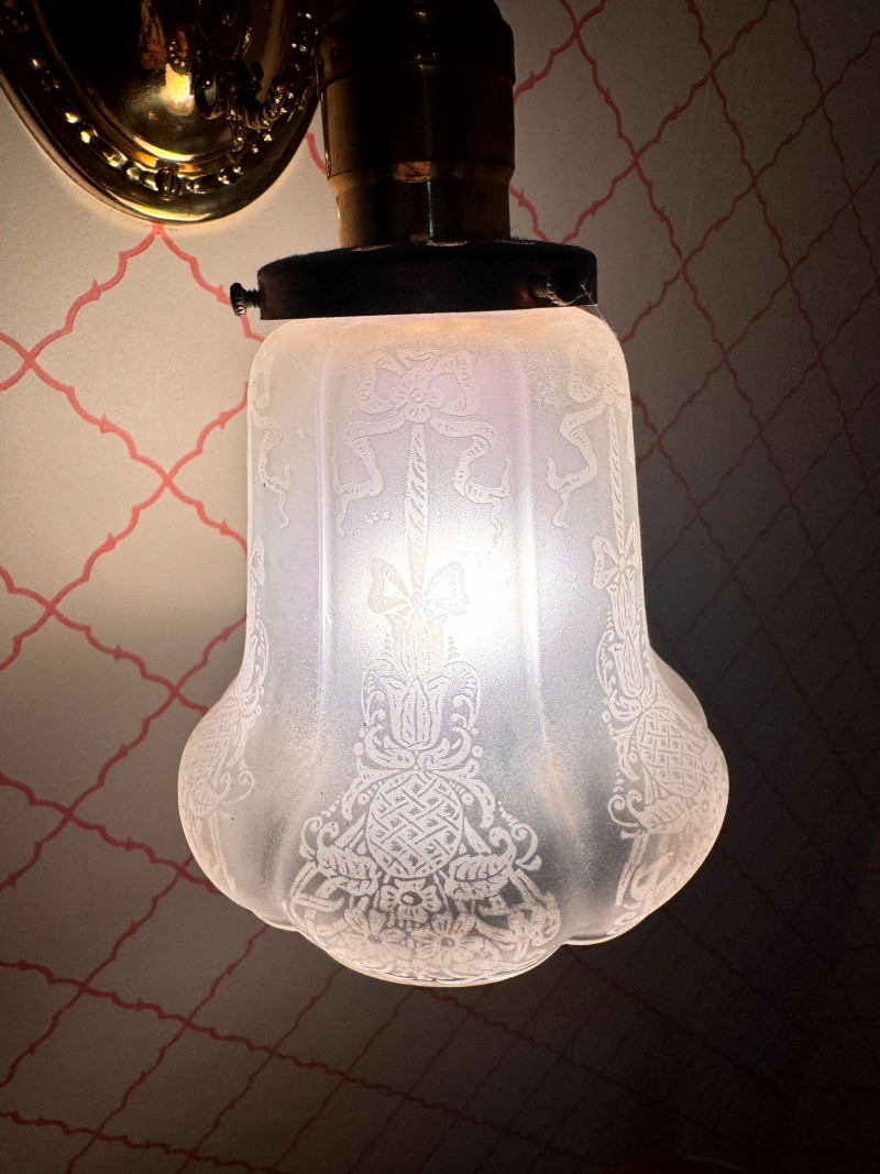 Antique Wall Sconces w/ Etched Glass Shades & Brass Arms.