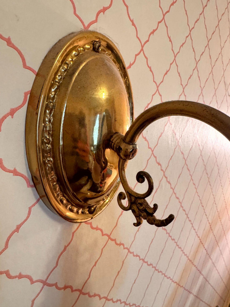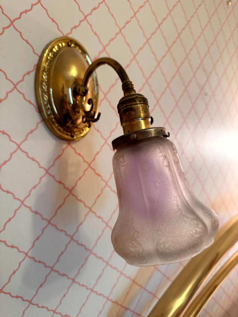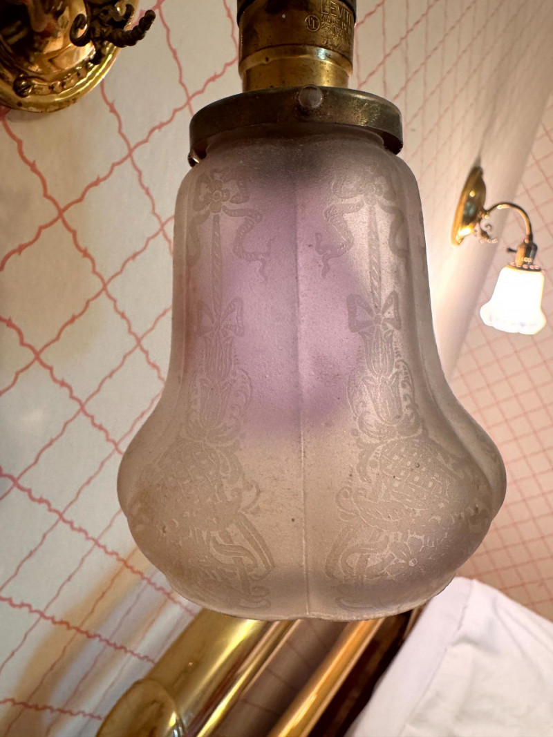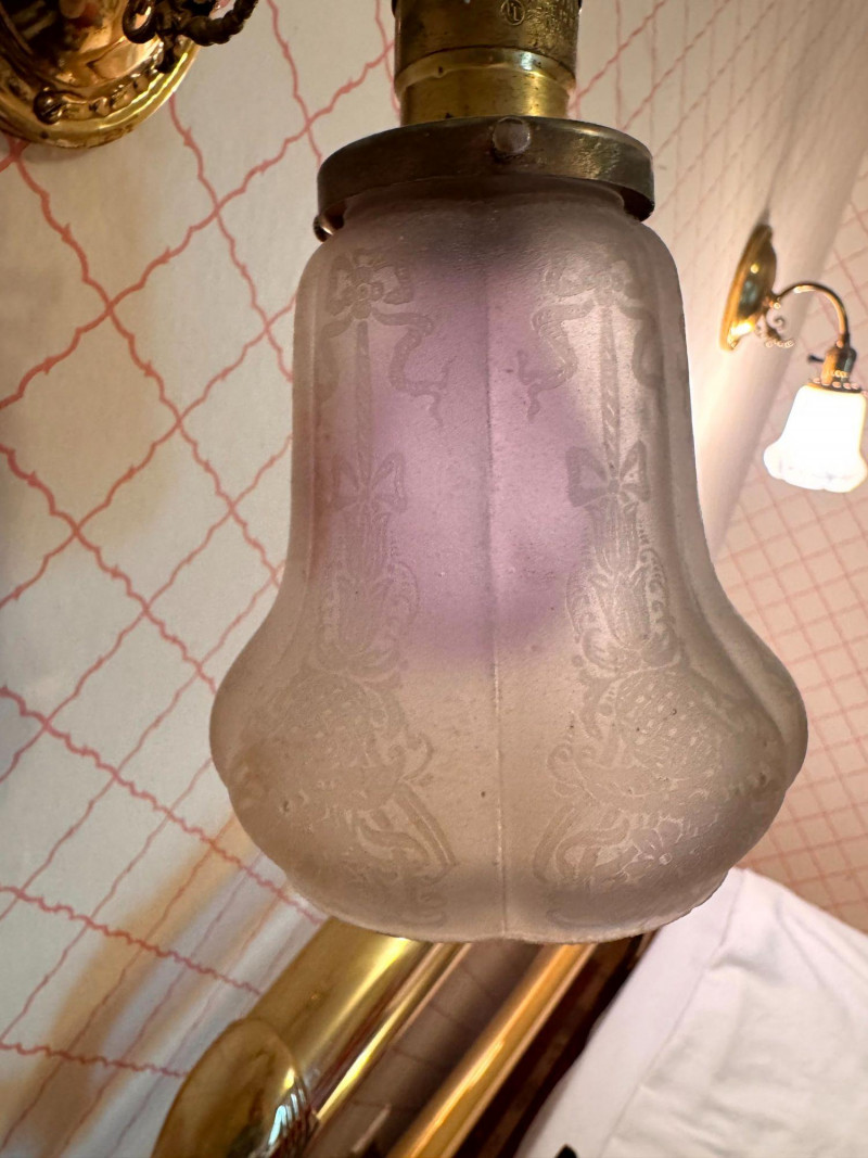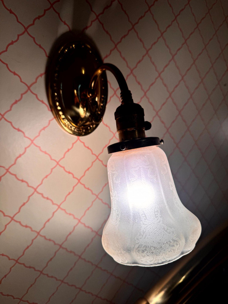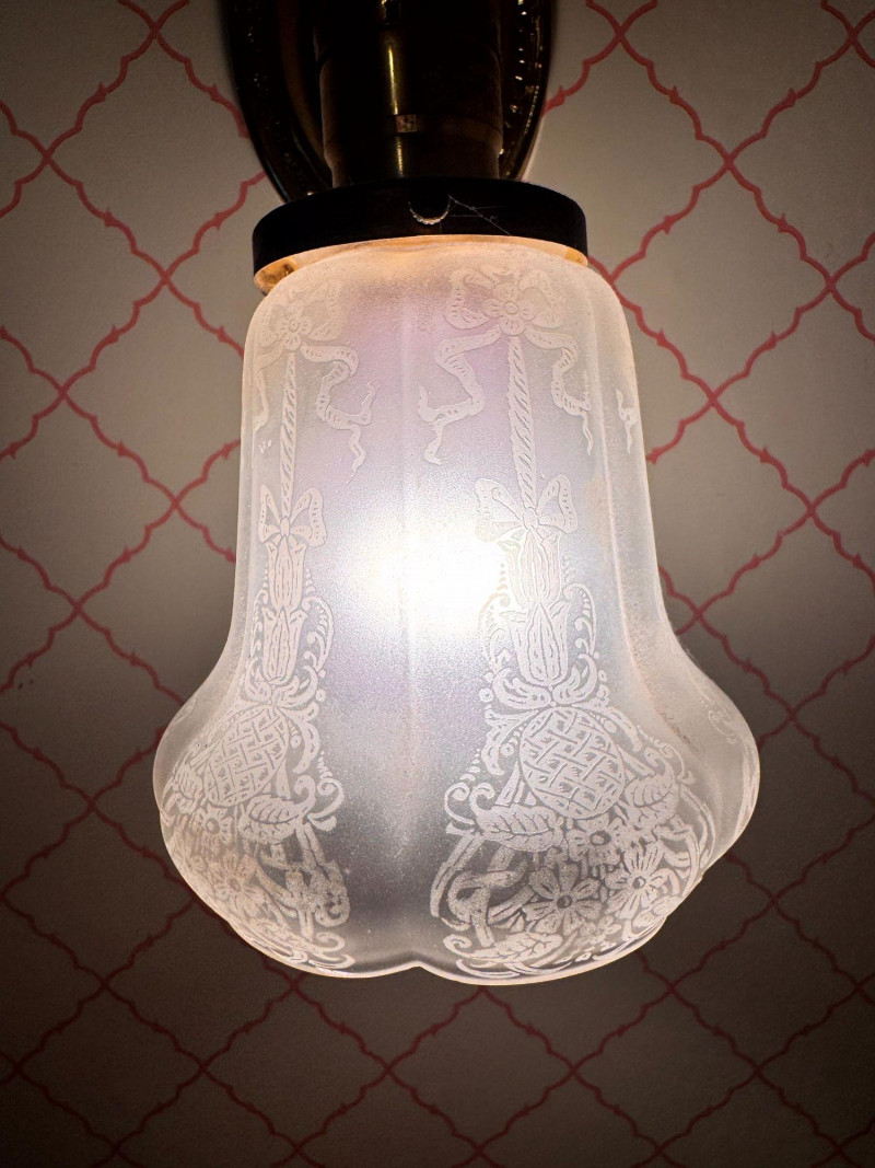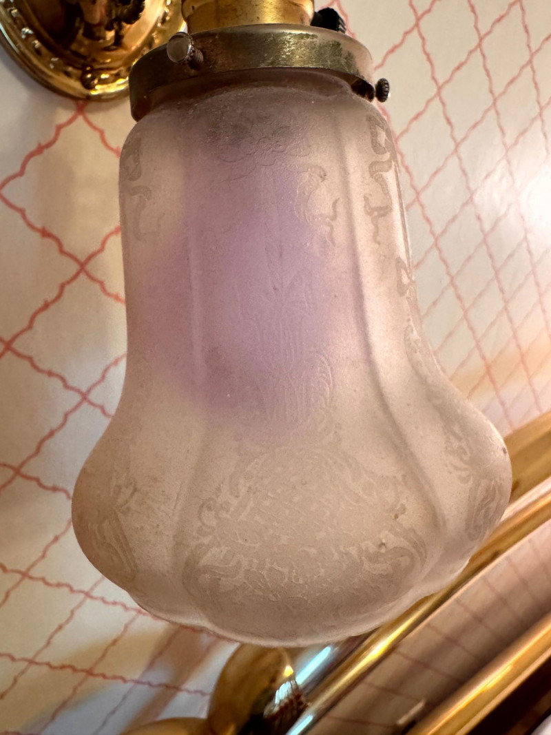 Antique Wall Sconces w/ Etched Glass Shades & Brass Arms.