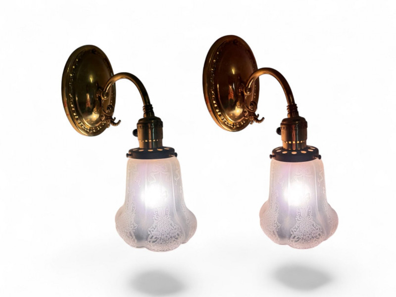 Lot # 22 - Antique Wall Sconces w/ Etched Glass Shades & Brass Arms