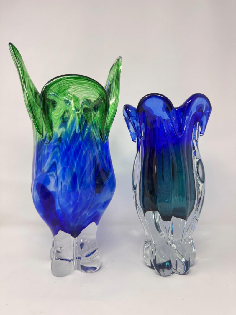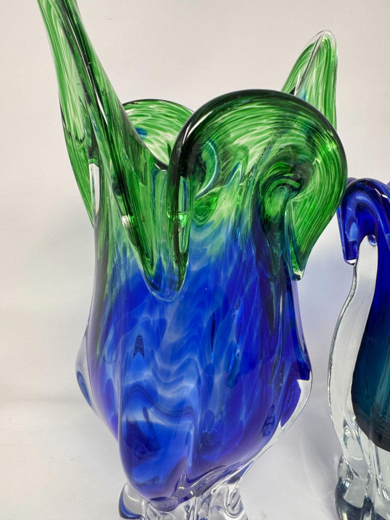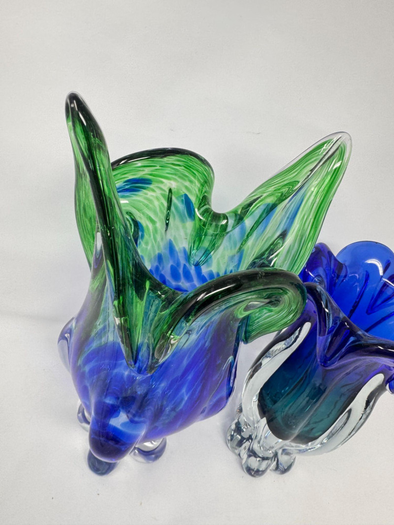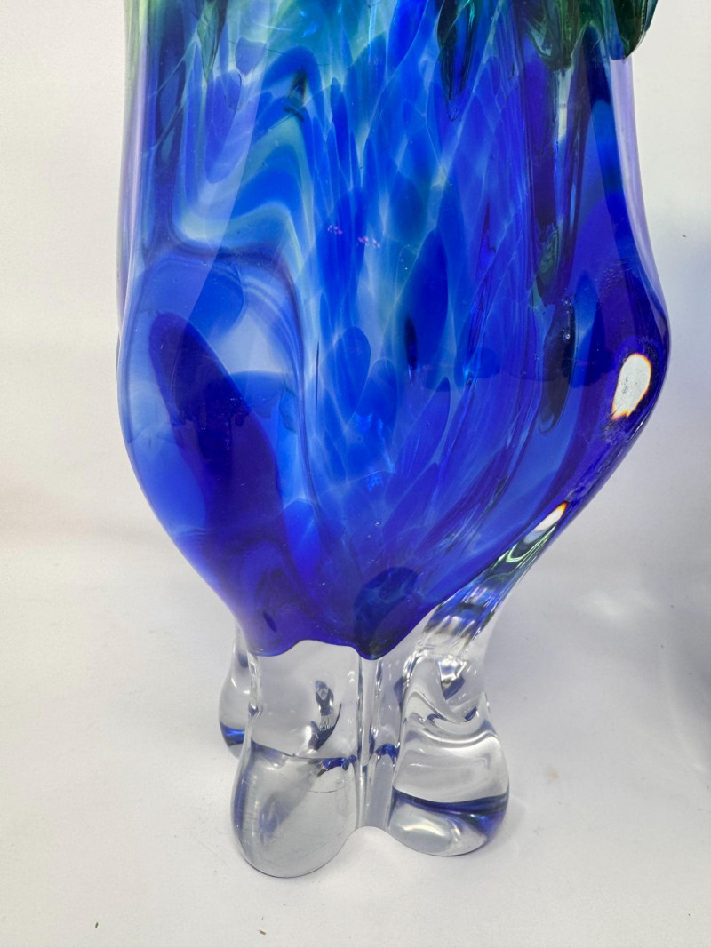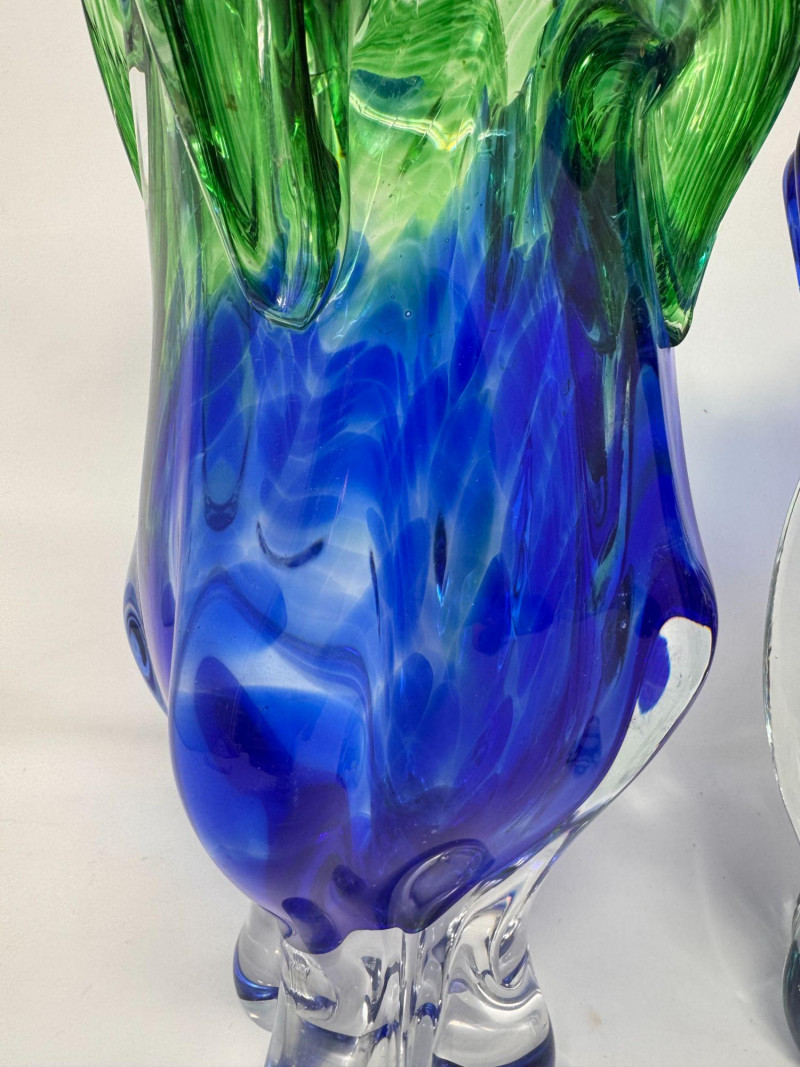 Hand Blown Sculptural Art Glass Vases w/ Blue & Green Swirl.