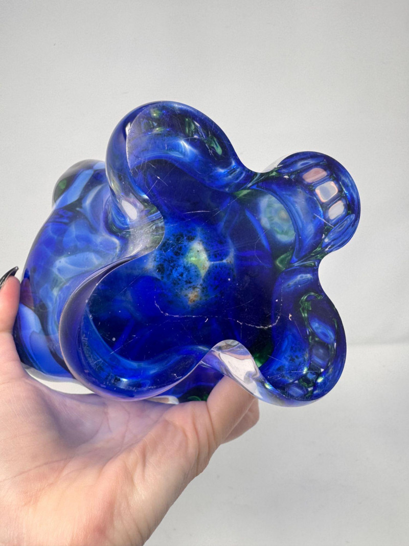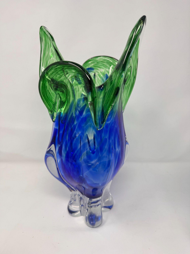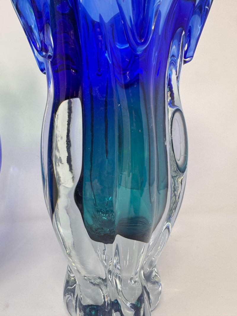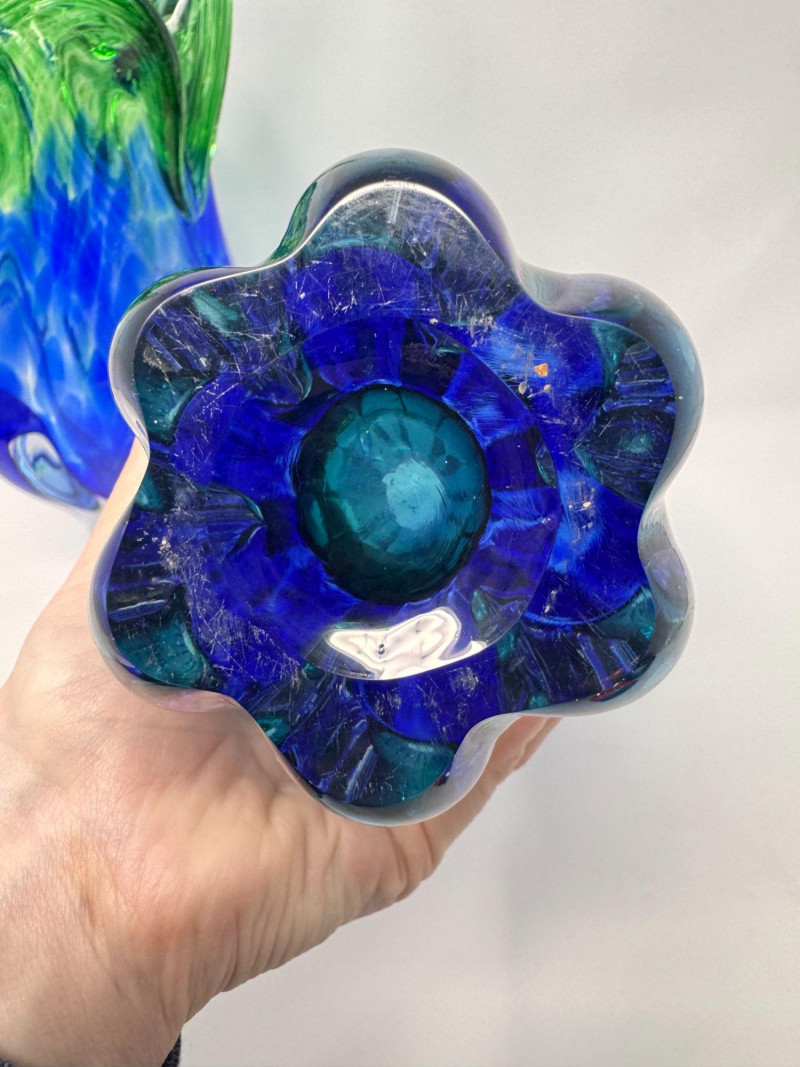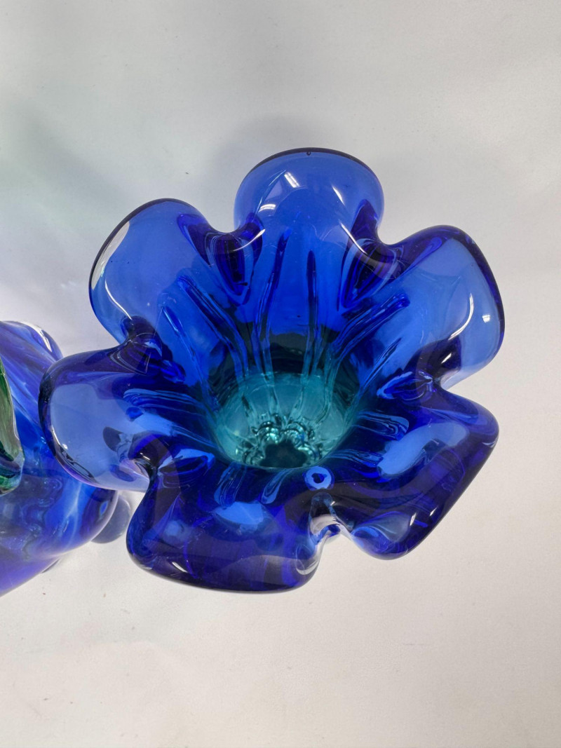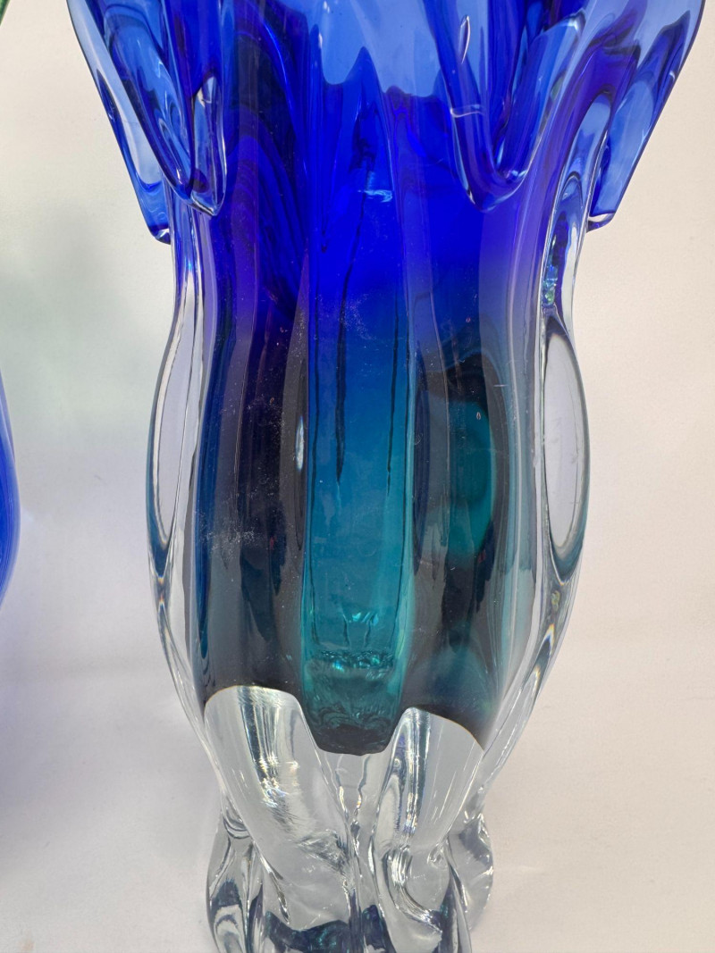 Hand Blown Sculptural Art Glass Vases w/ Blue & Green Swirl.