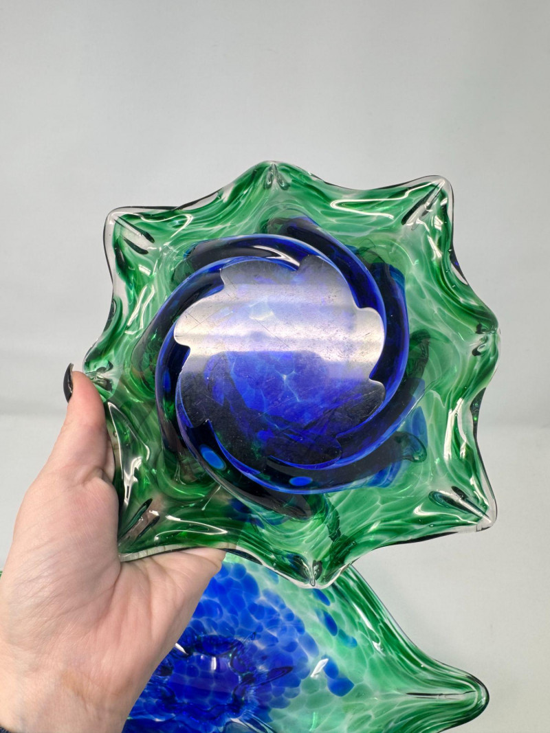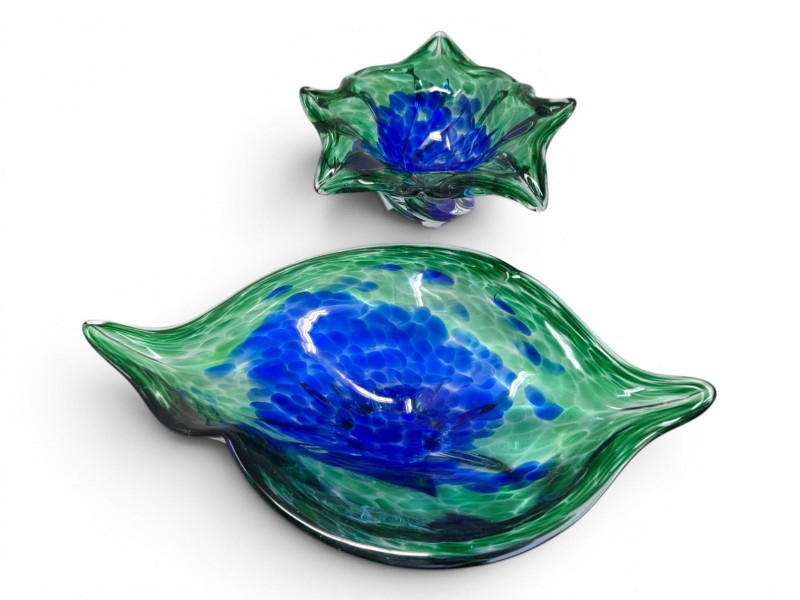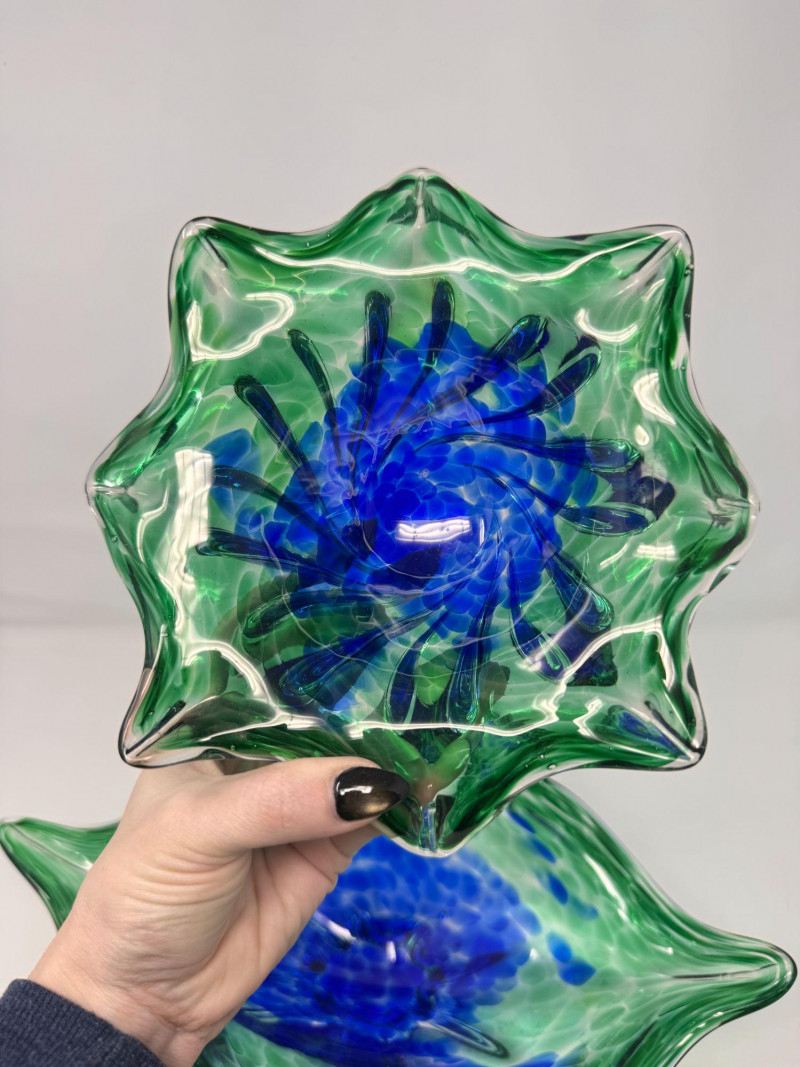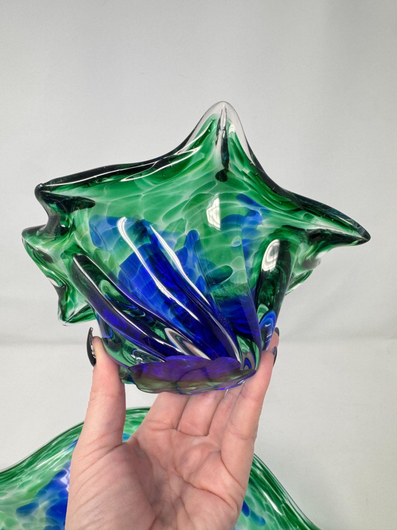 Hand Blown Art Glass Bowls - Freeform w/ Blue Green Swirl.