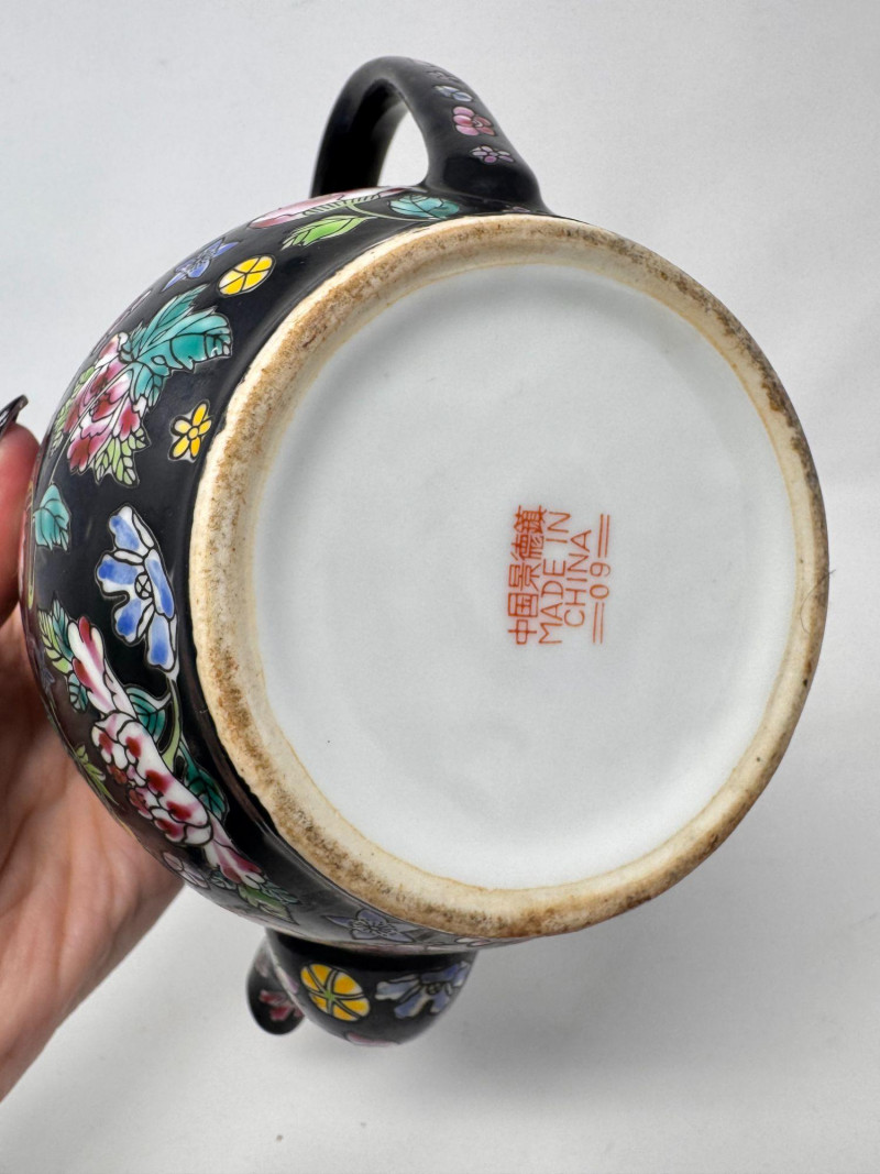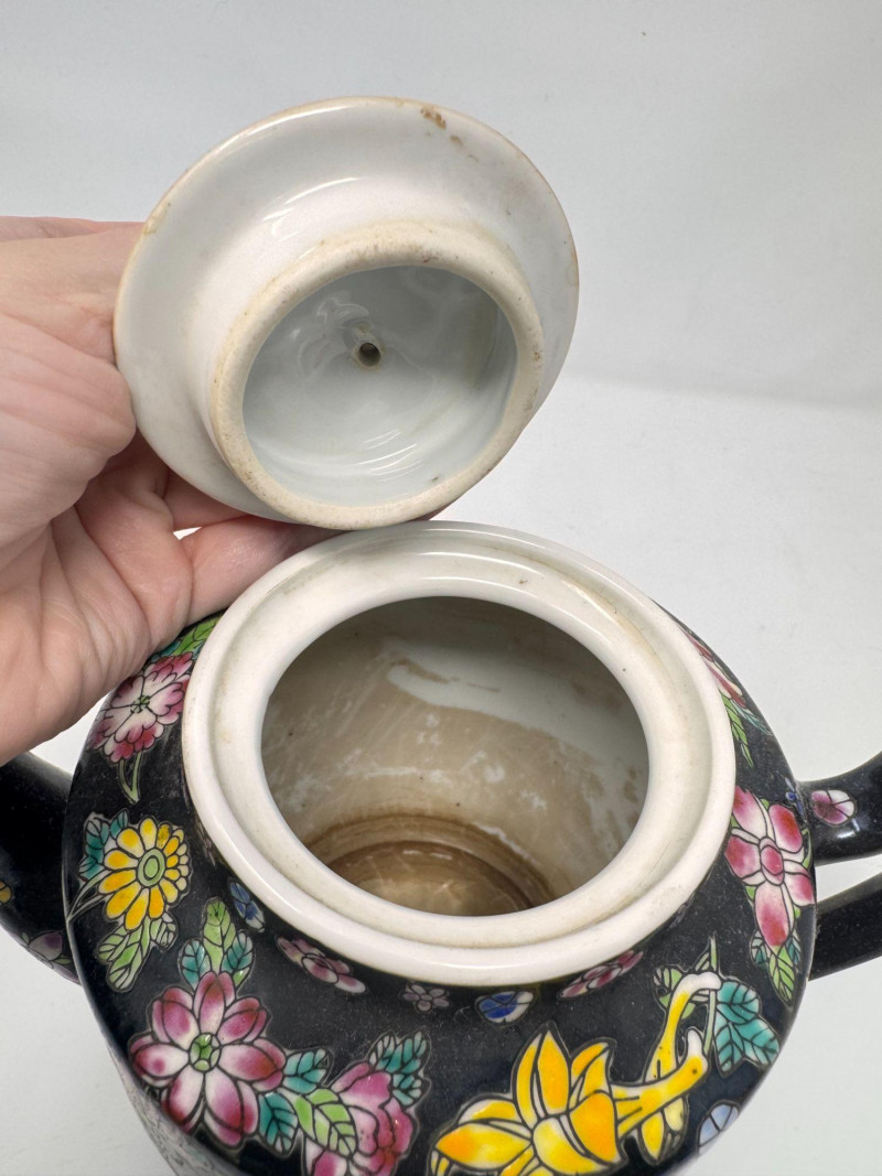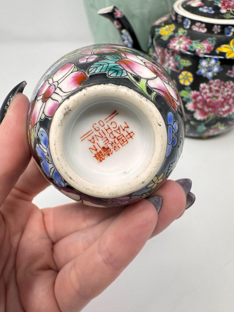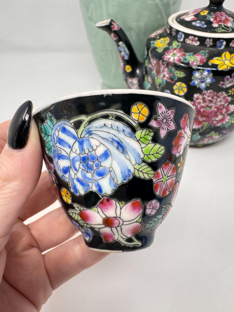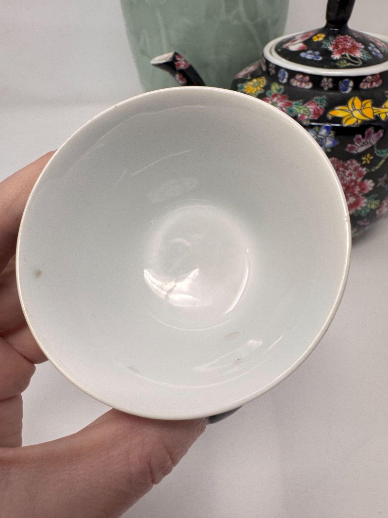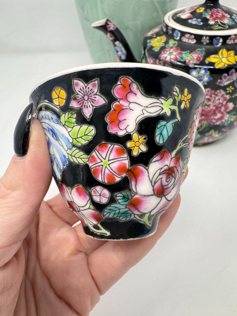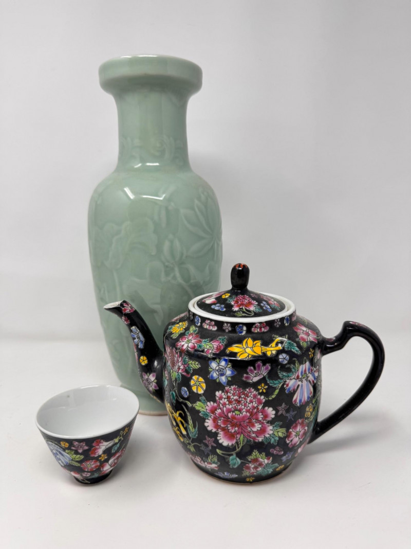 Large Asian Celadon Vase + Floral Porcelain Teapot & Cup.