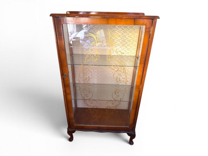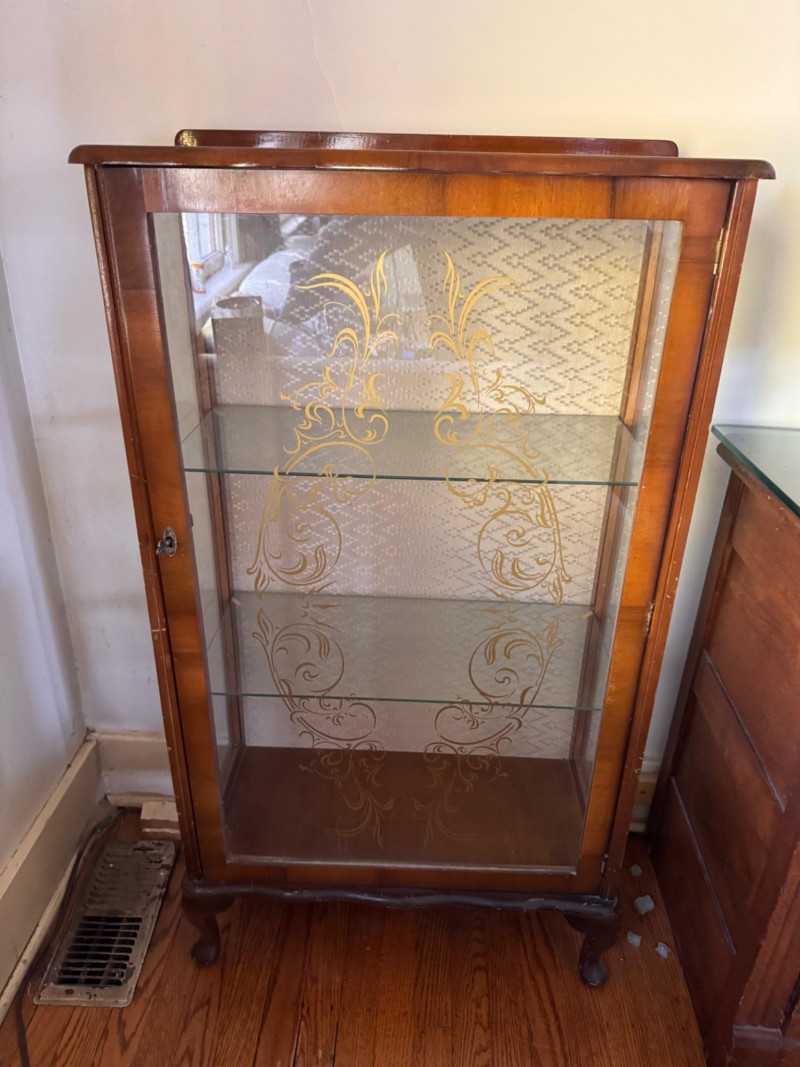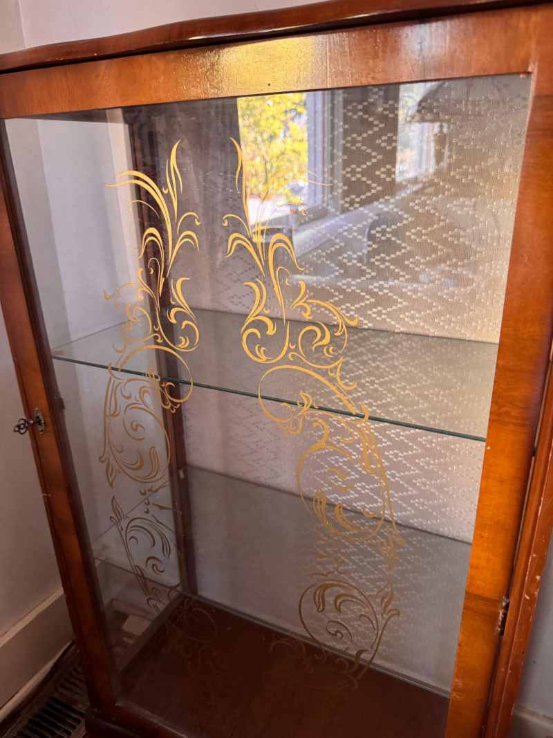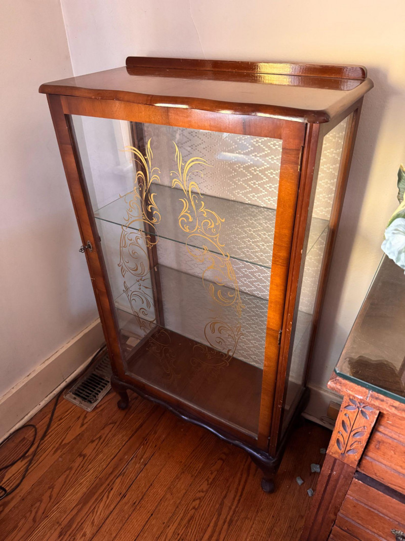 Antique Curio Cabinet w/ Gold Etched Glass Door & Wood Display Case.Condition: