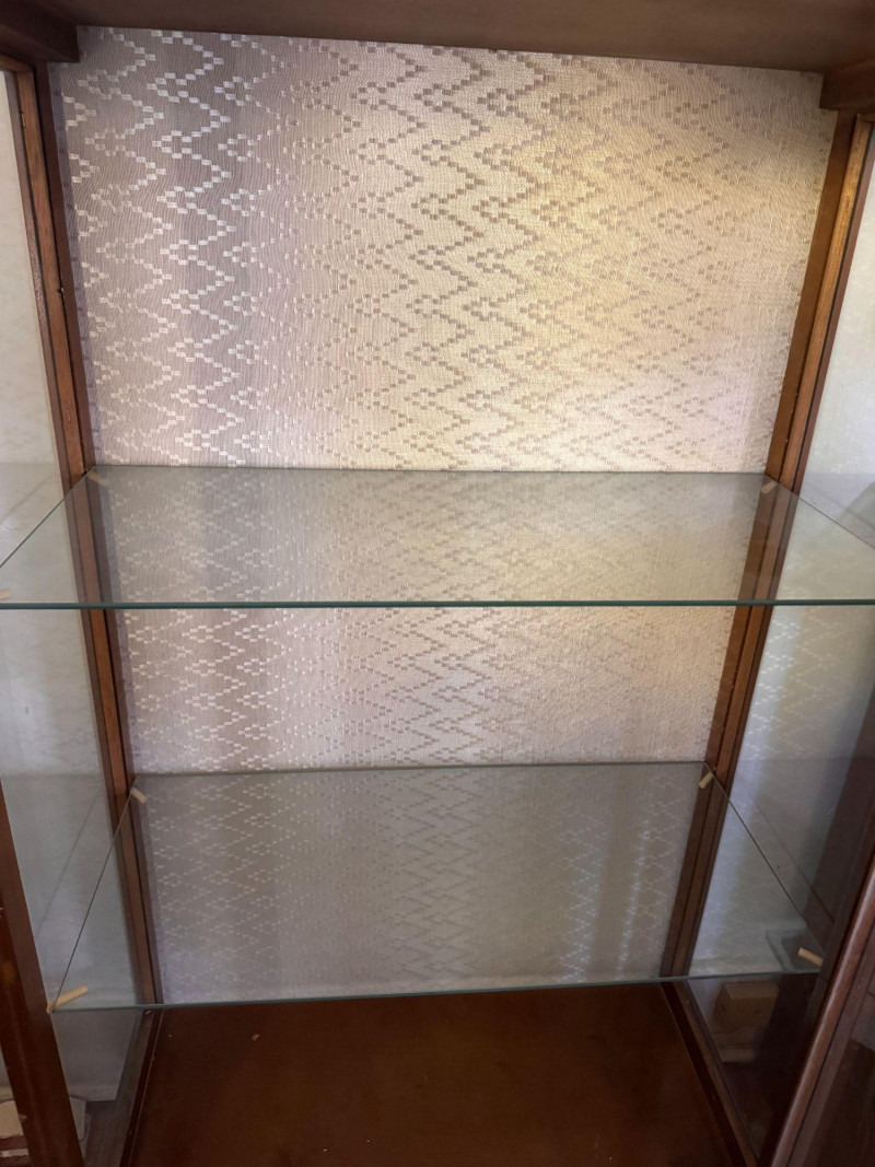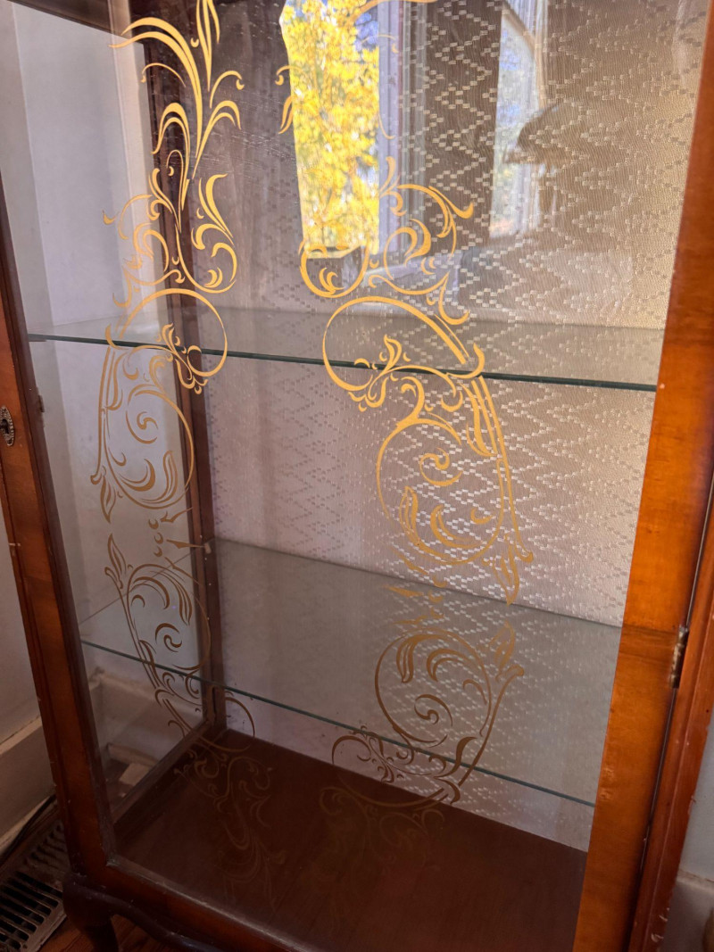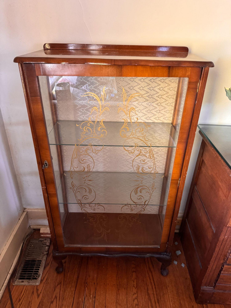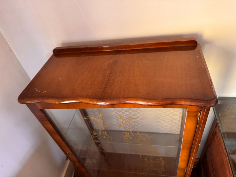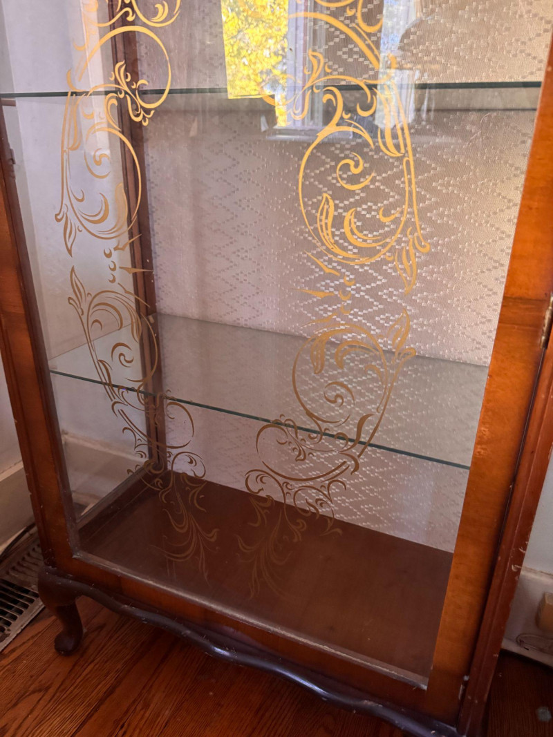 Antique Curio Cabinet w/ Gold Etched Glass Door & Wood Display Case.Condition: