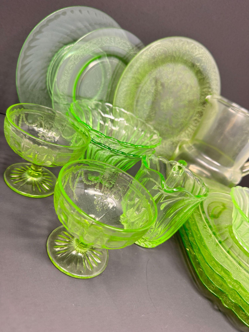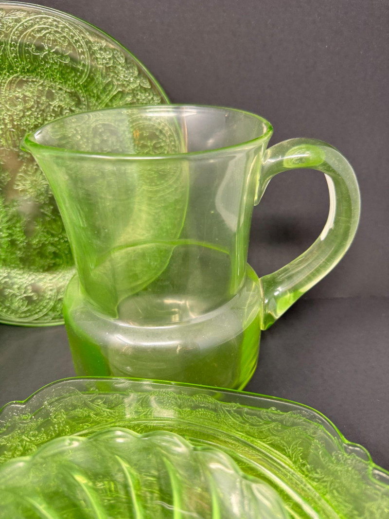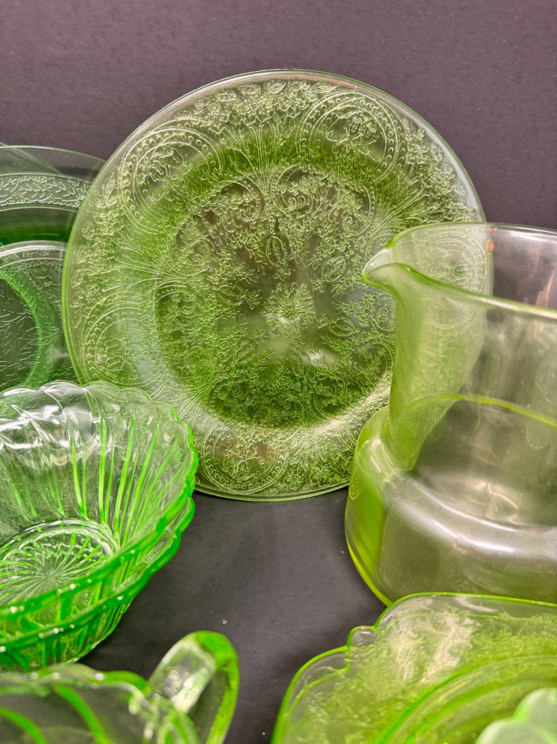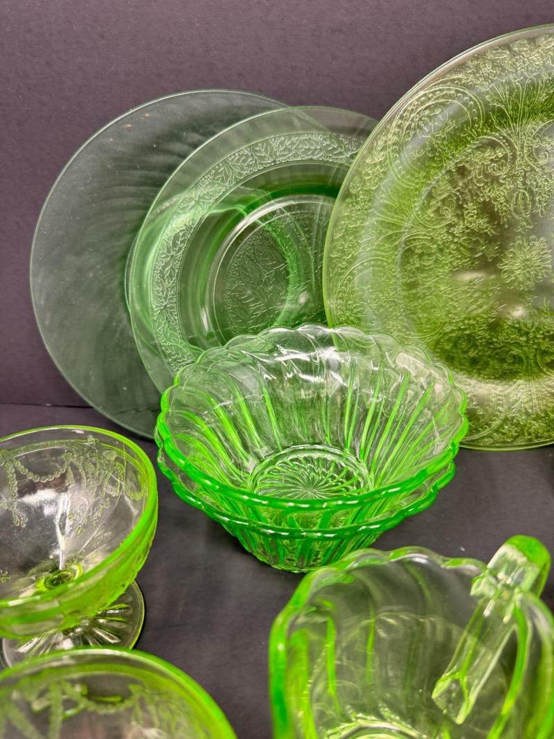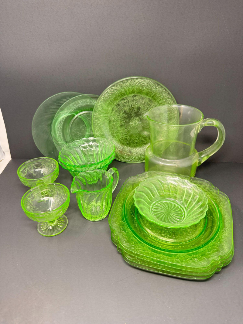 Uranium Green Depression Glass - Plates, Bowls, Pitcher, Creamer +