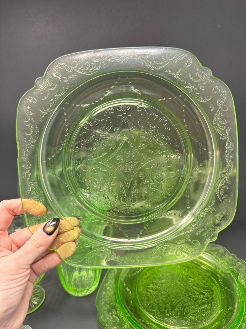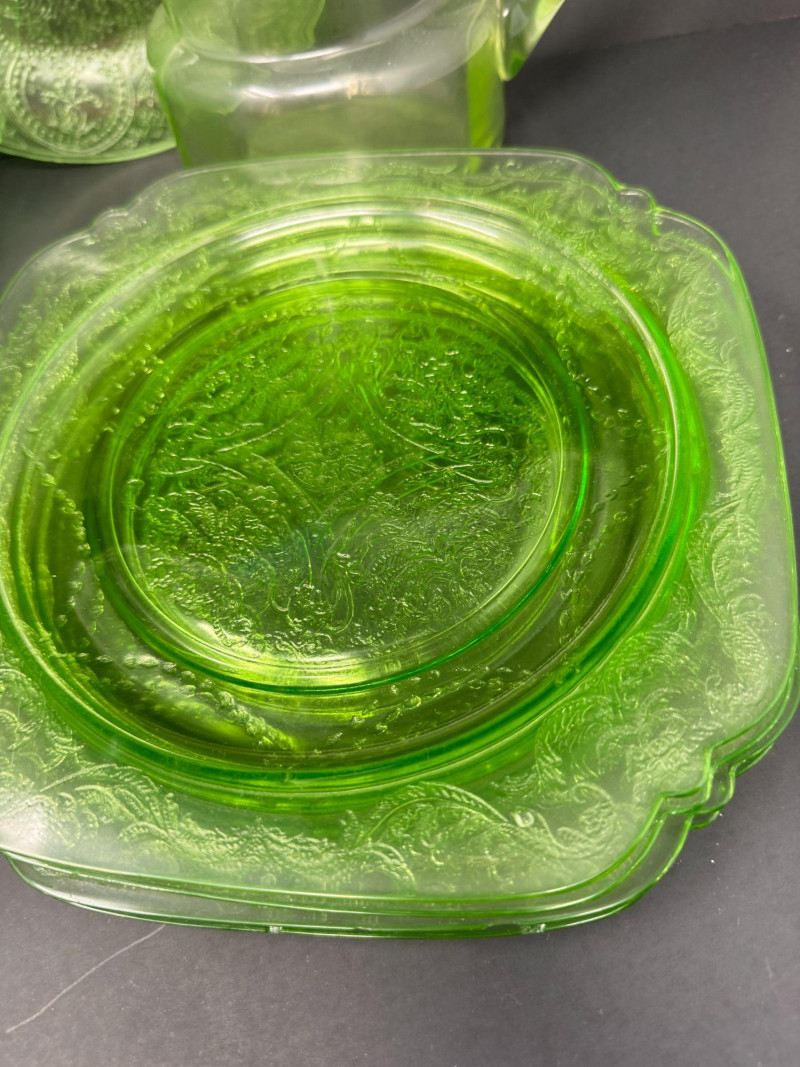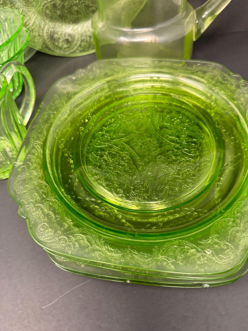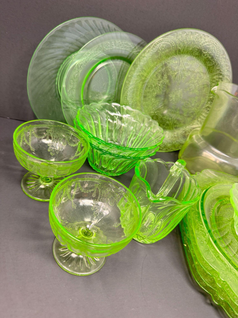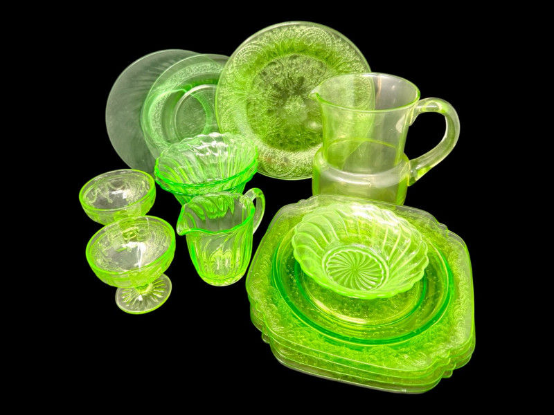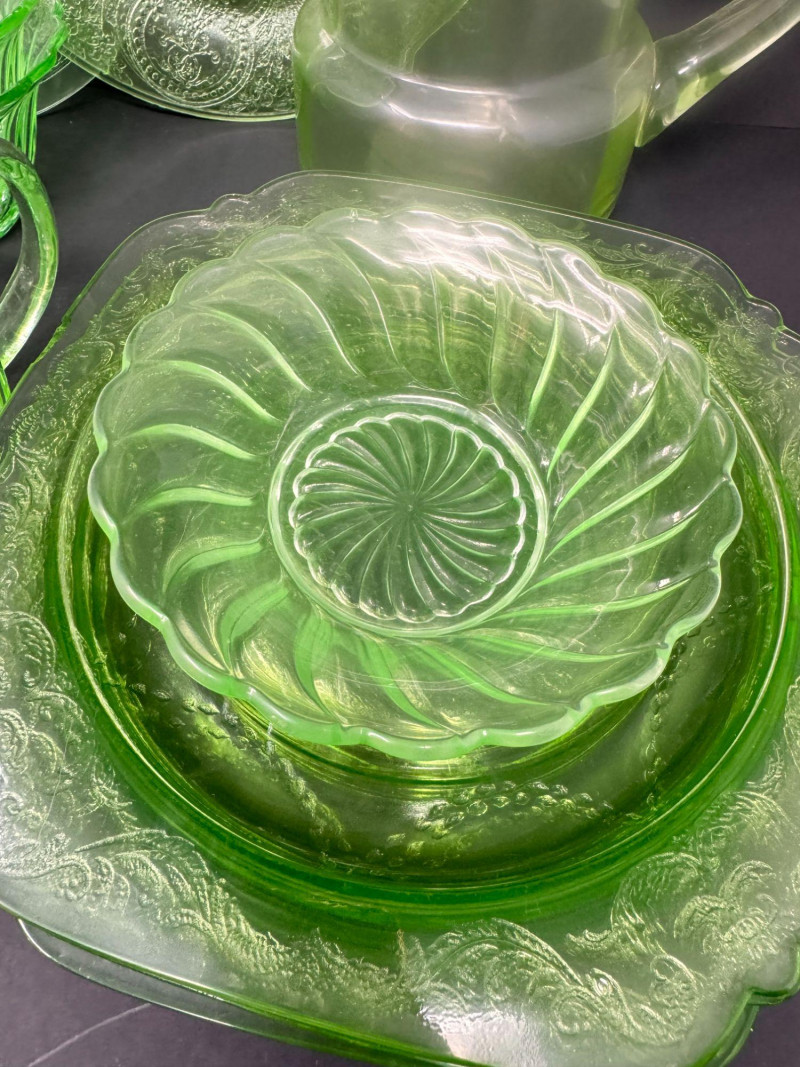 Uranium Green Depression Glass - Plates, Bowls, Pitcher, Creamer +