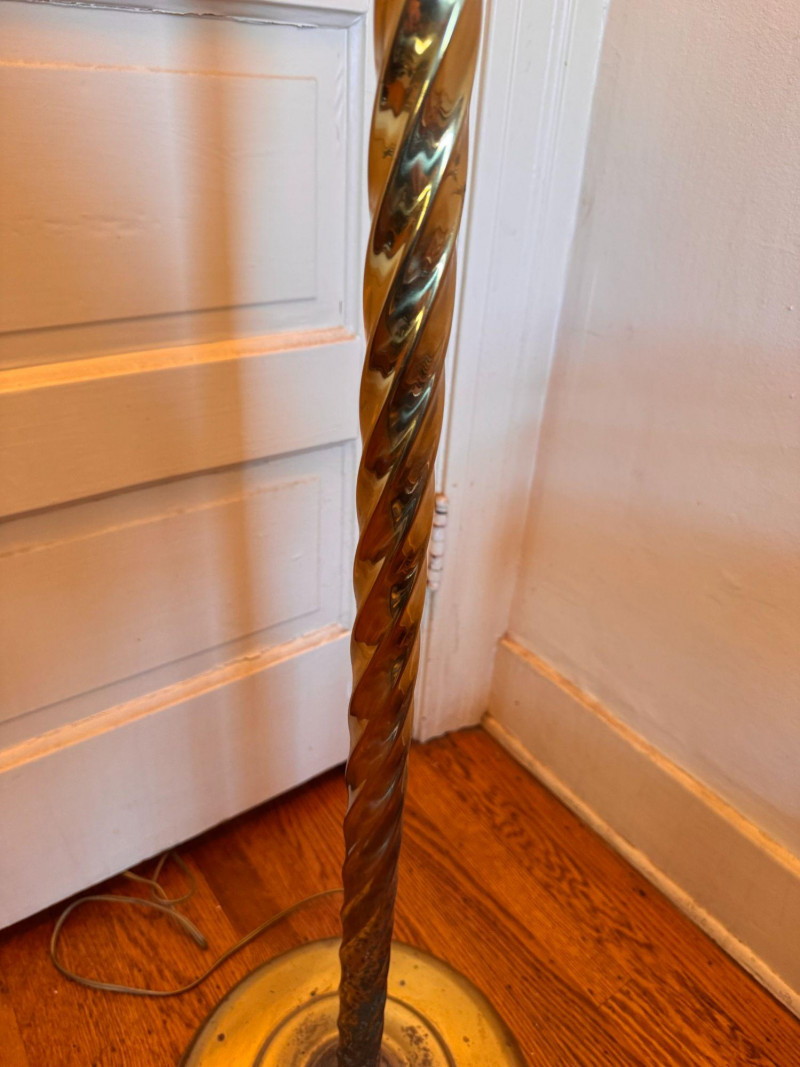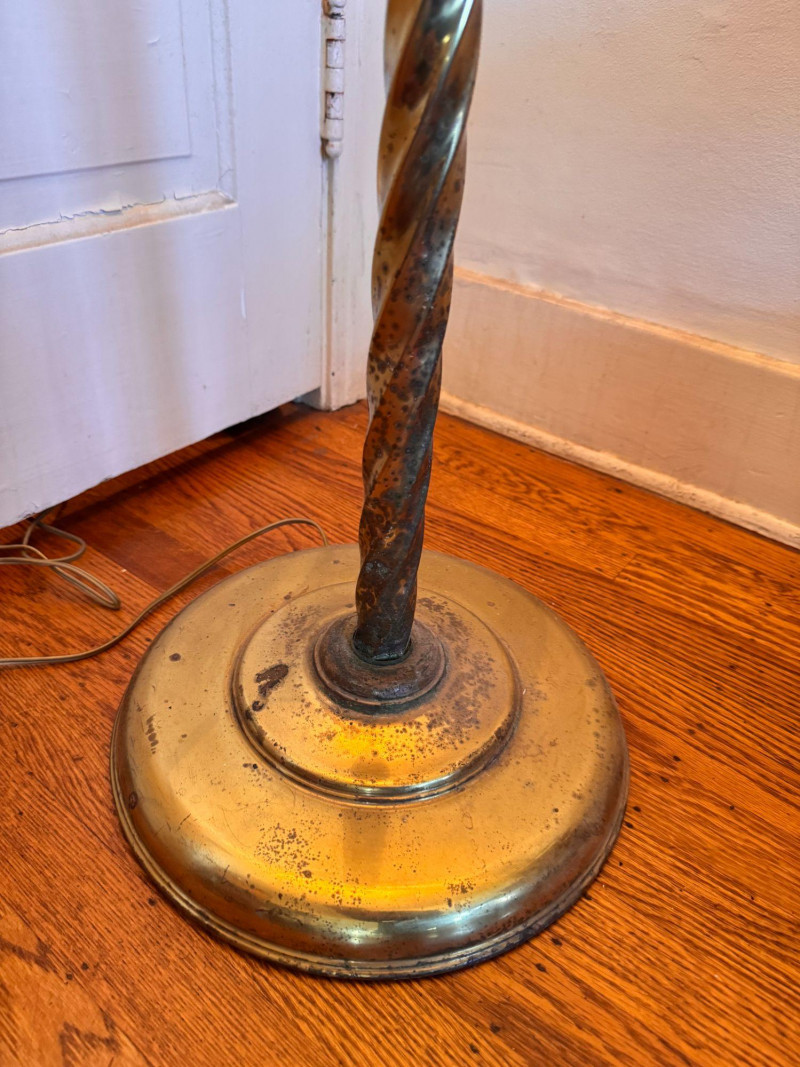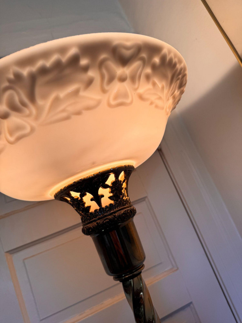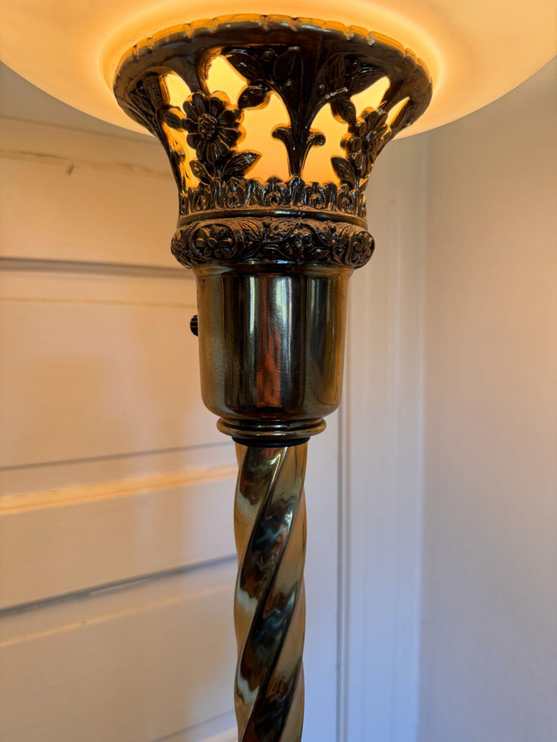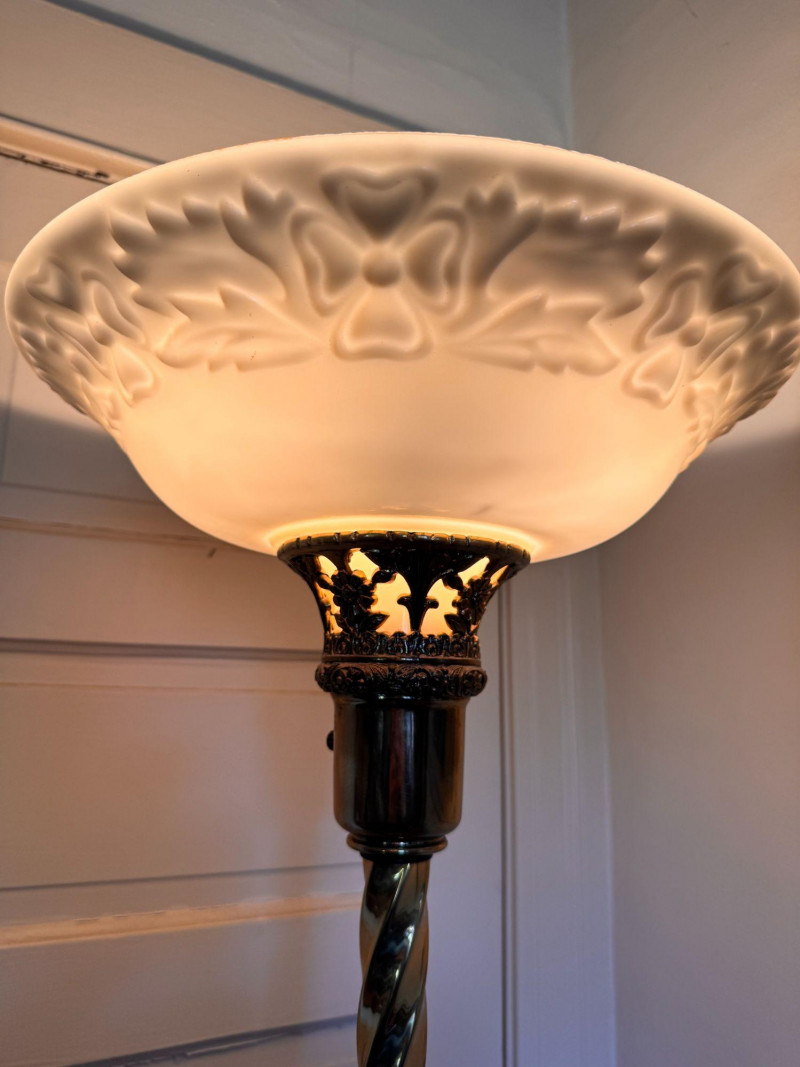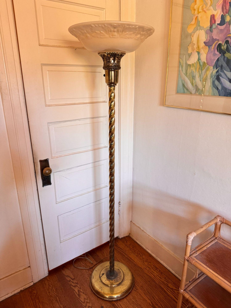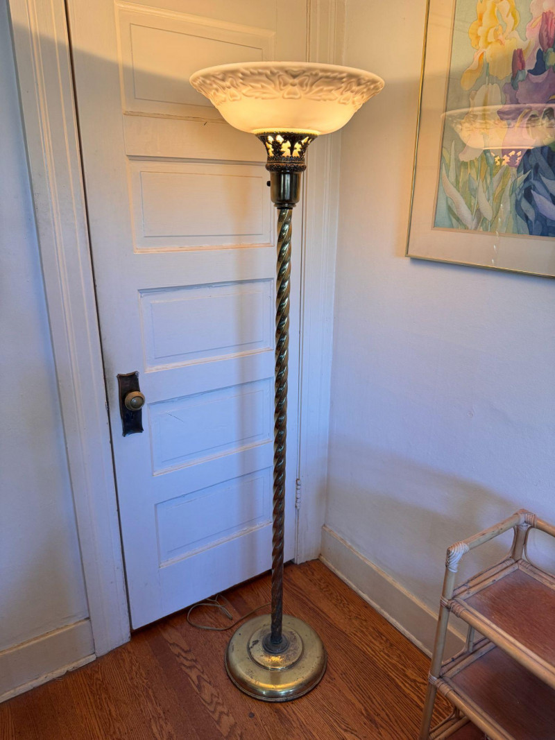 Vintage Torchiere Floor Lamp w/ Frosted Glass Shade & Twisted Column.
