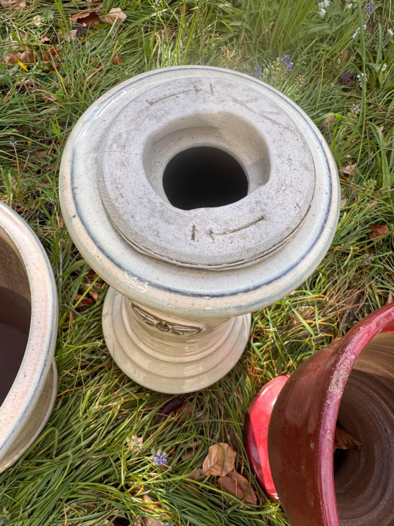 Lot # 112 - 3 Garden Planters & Bird Bath Base - Ceramic Pots w/ Bee Motif