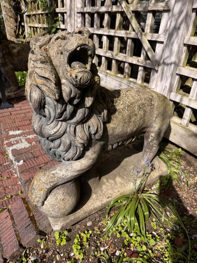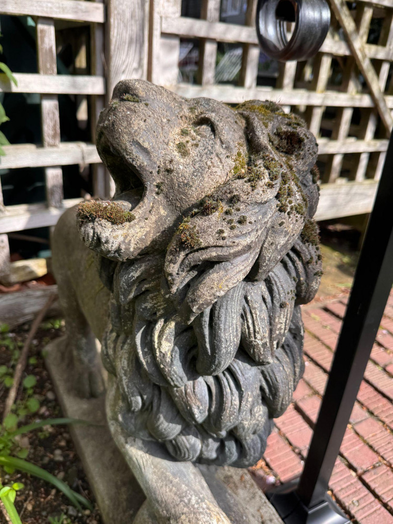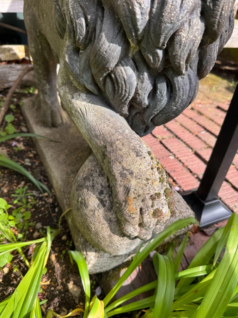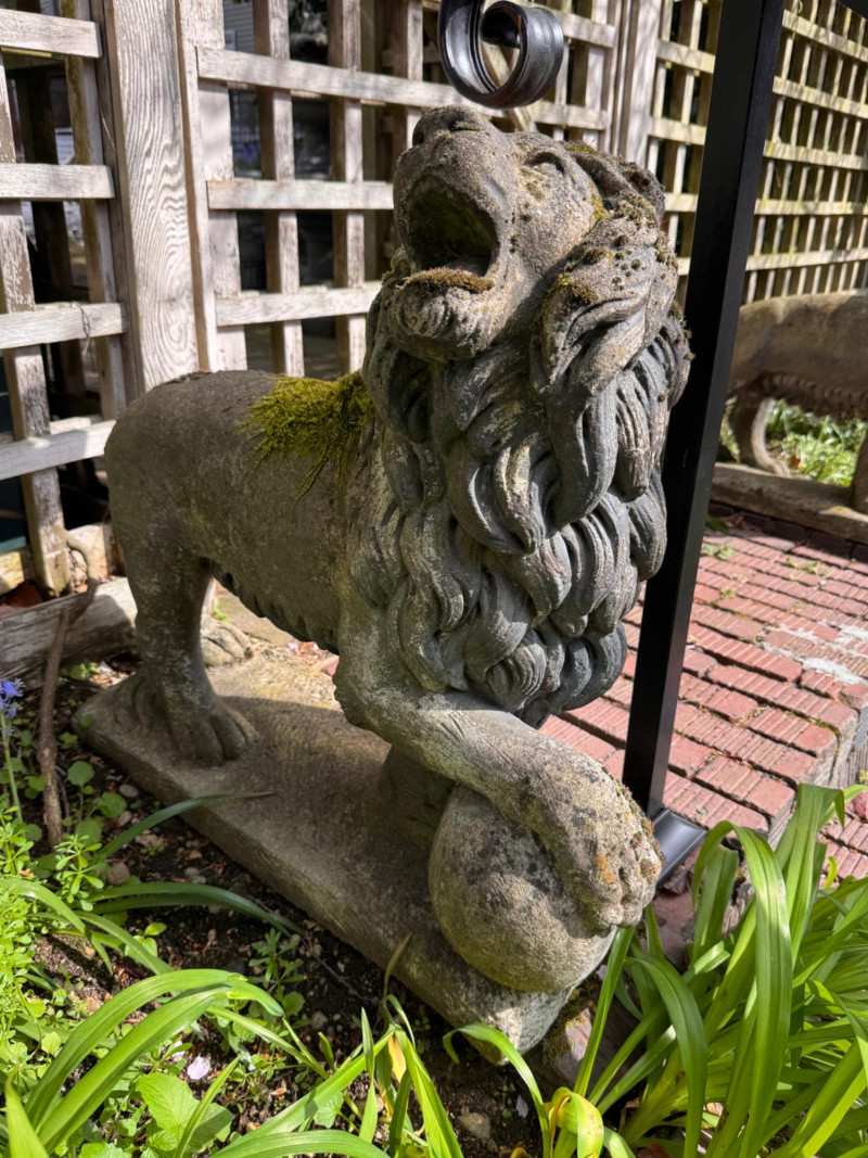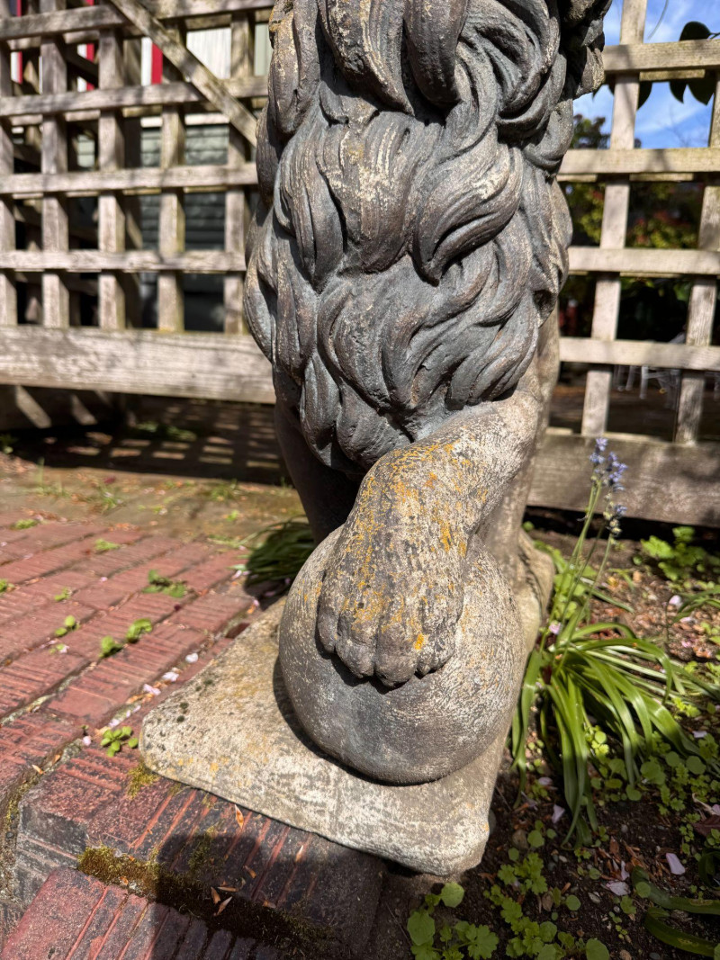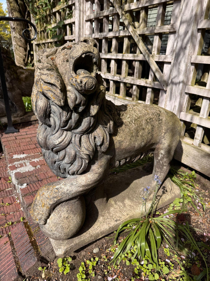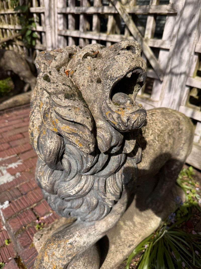Both lions have cracking present on the tails and are extremely heavy. If the lions break during removal, no refunds will be given. Bid knowing there is existing damage, potential for further breakage, and that repair may be needed. By placing a bid, you agree that you will bring at least two capable, able-bodied persons to lift and load the item, as well as a hand truck and any necessary tools for removal. Failure to meet these requirements will result in item forfeiture with no refund.