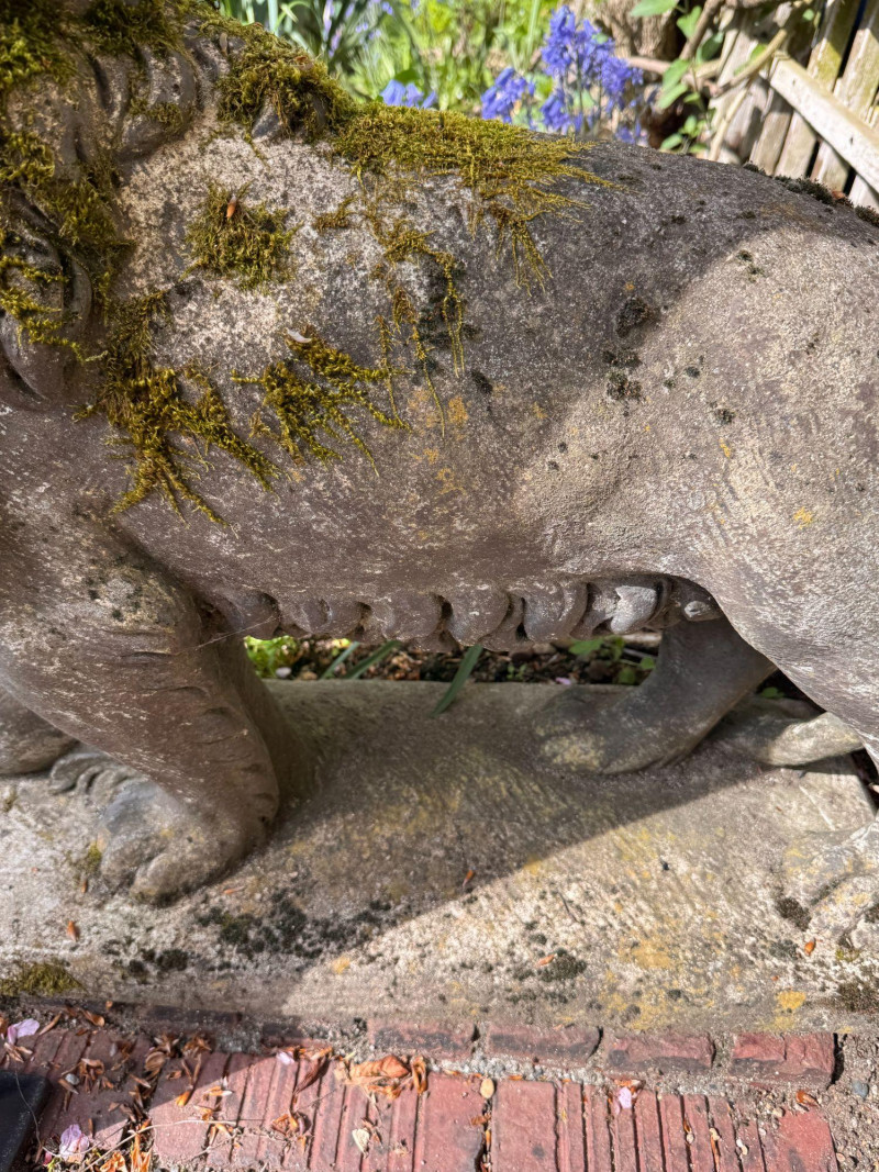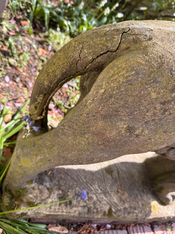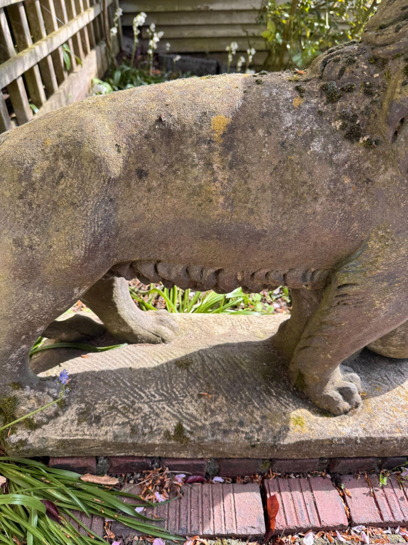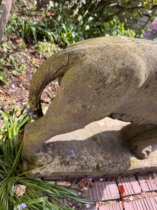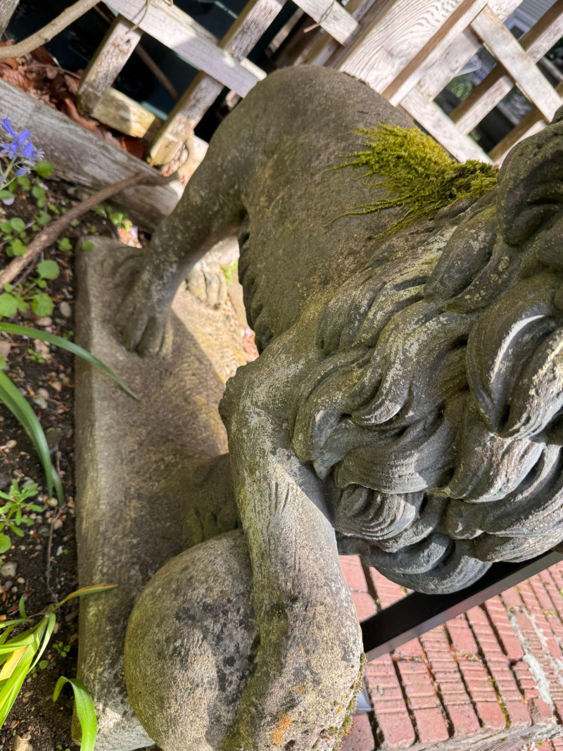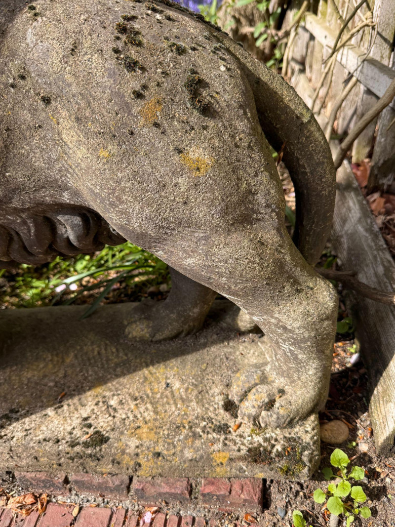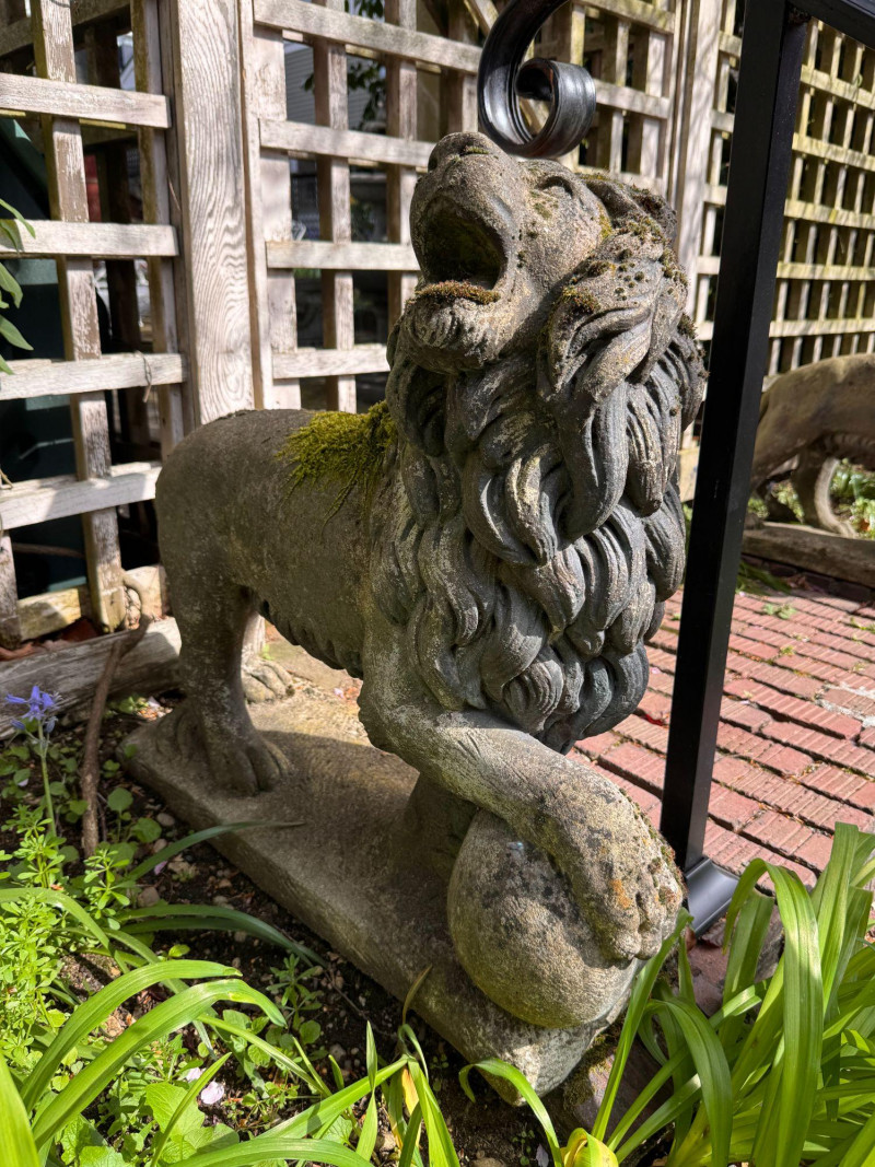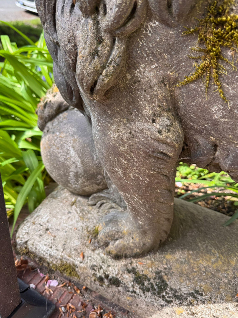 Both lions have cracking present on the tails and are extremely heavy. If the lions break during removal, no refunds will be given. Bid knowing there is existing damage, potential for further breakage, and that repair may be needed. By placing a bid, you agree that you will bring at least two capable, able-bodied persons to lift and load the item, as well as a hand truck and any necessary tools for removal. Failure to meet these requirements will result in item forfeiture with no refund.