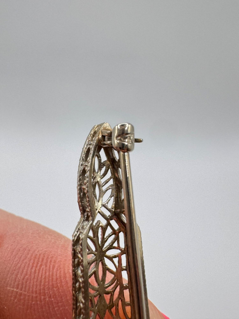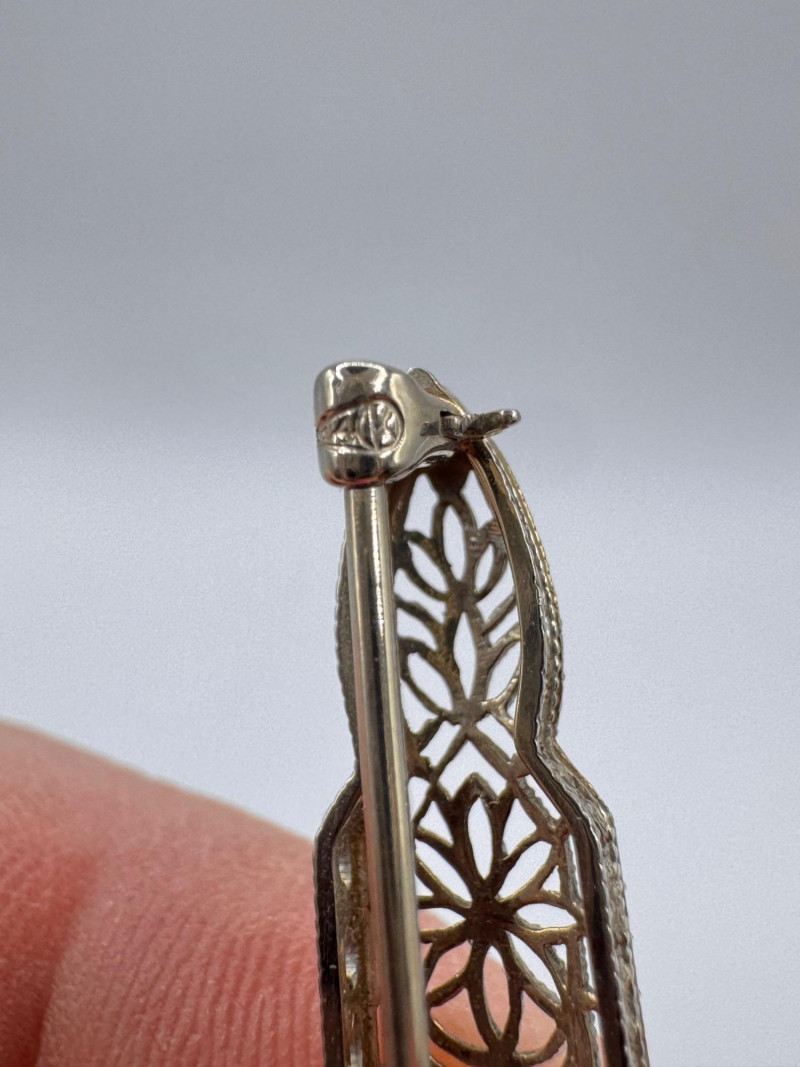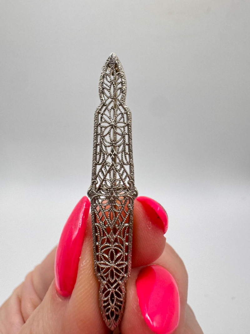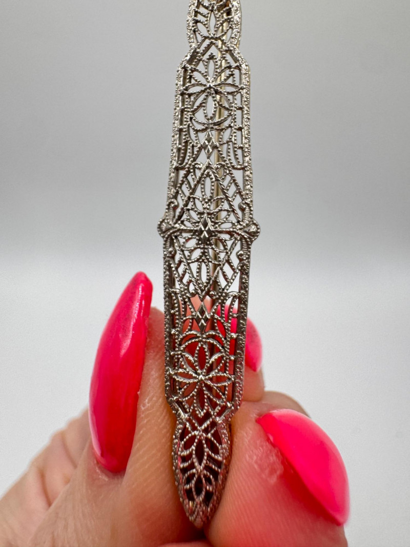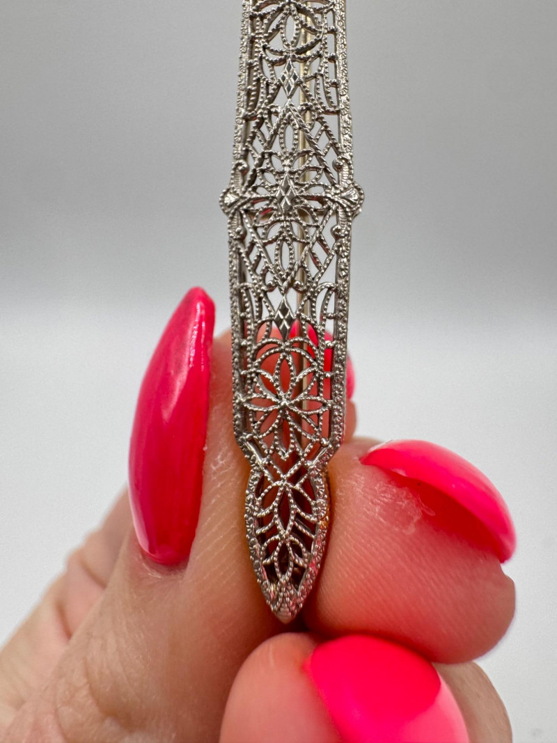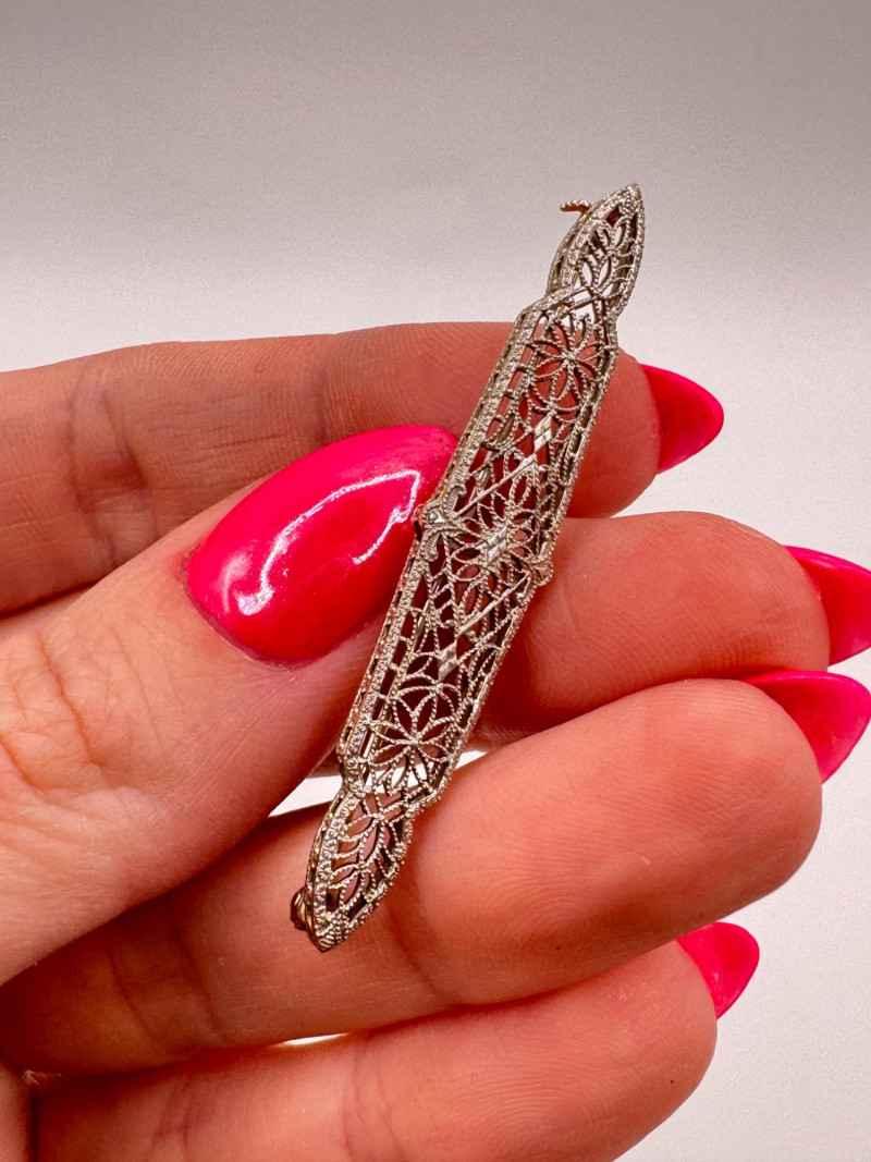 14K White Gold Open Work Filigree Bar Pin - Tested, 3.06g.