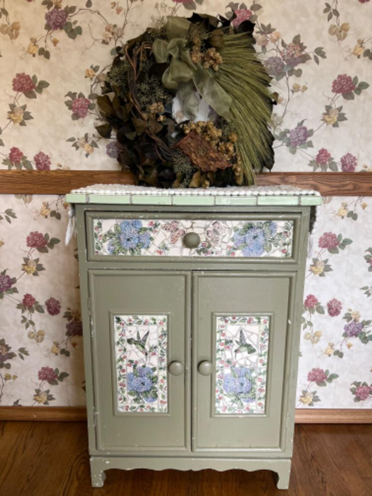 Lot # 12 - Petite Storage Cabinet With Mosaics + Dried Wreath Starting Bid: $ 5.00 Bids: This sale will end in: |