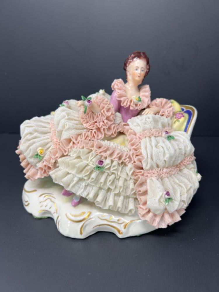 Lot # 14 - Reclining Dresden Figure With Lace Ruffles Starting Bid: $ 5.00 Bids: This sale will end in: |