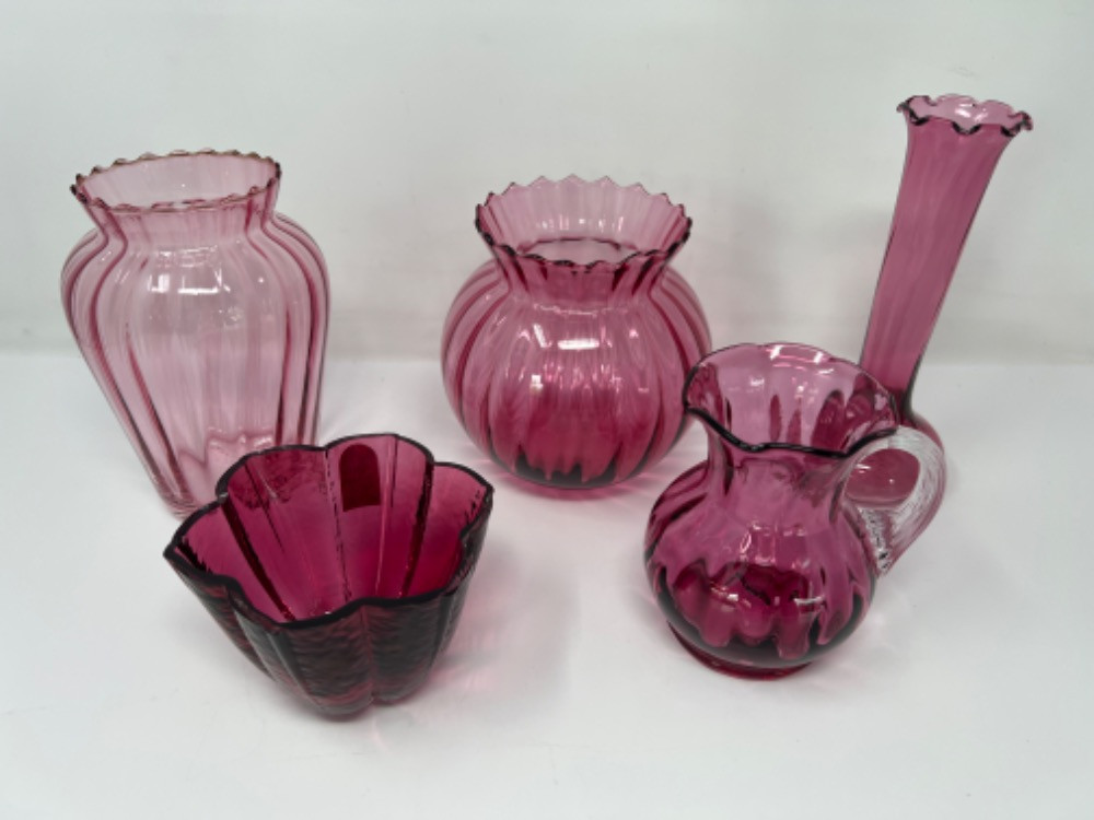 Lot # 24 - Assorted Vintage Cranberry Glass Collection- Vases & Pitcher Starting Bid: $ 5.00 Bids: This sale will end in: |
