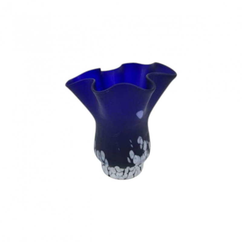 Blue Art Glass Vase w/ Ruffled Rim & White Pebble Base.