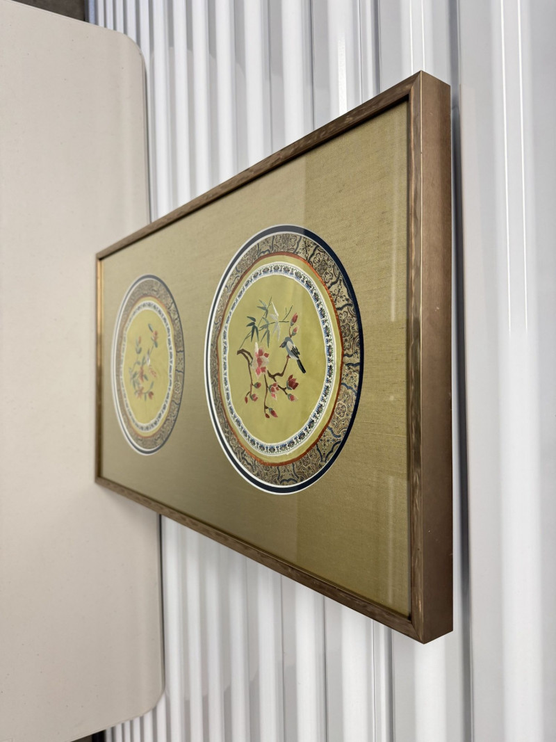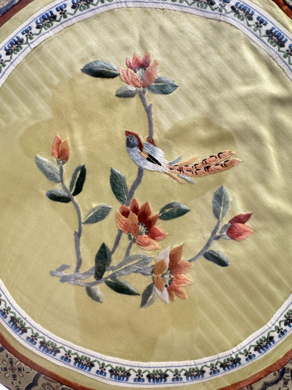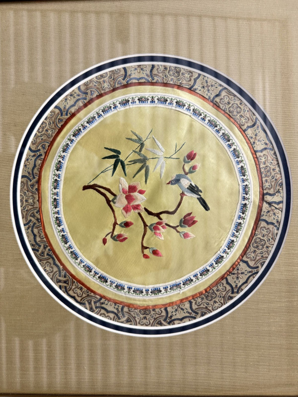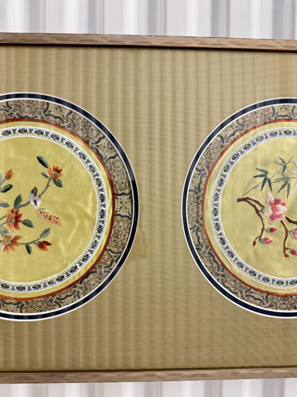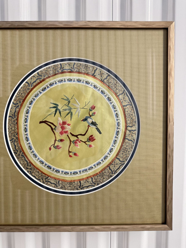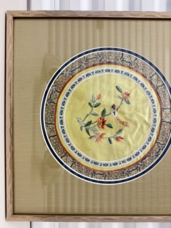 Framed Asian Silk Embroidery w/ Birds & Floral Design.