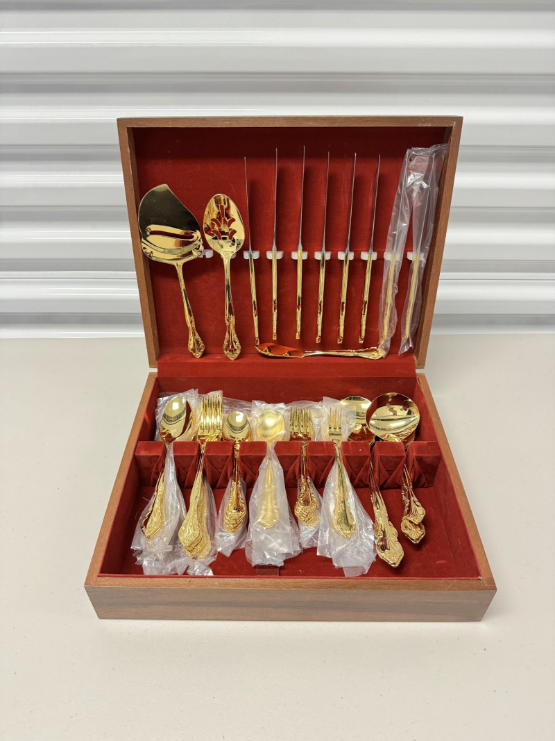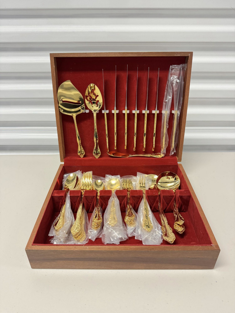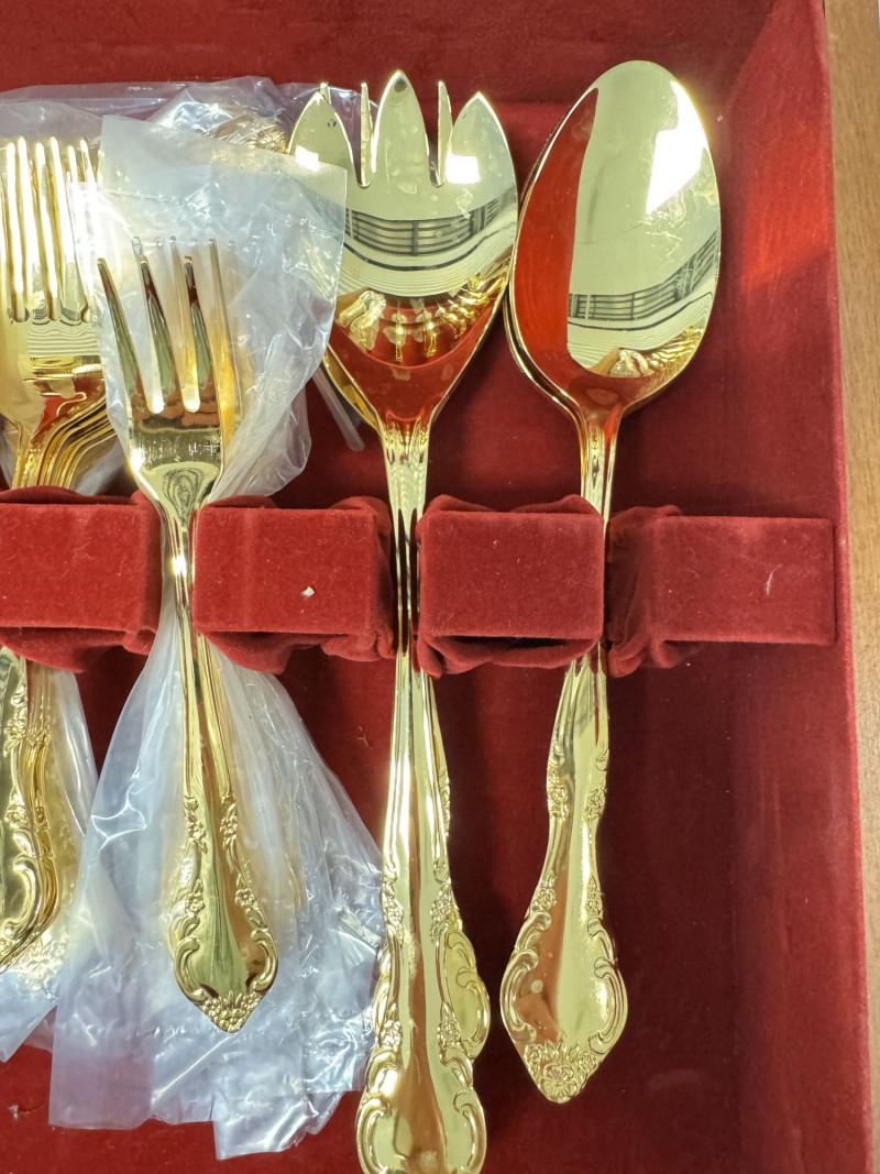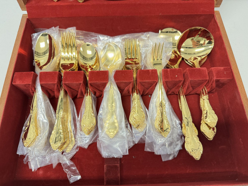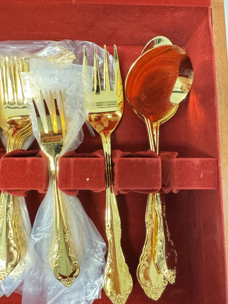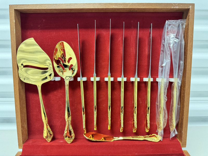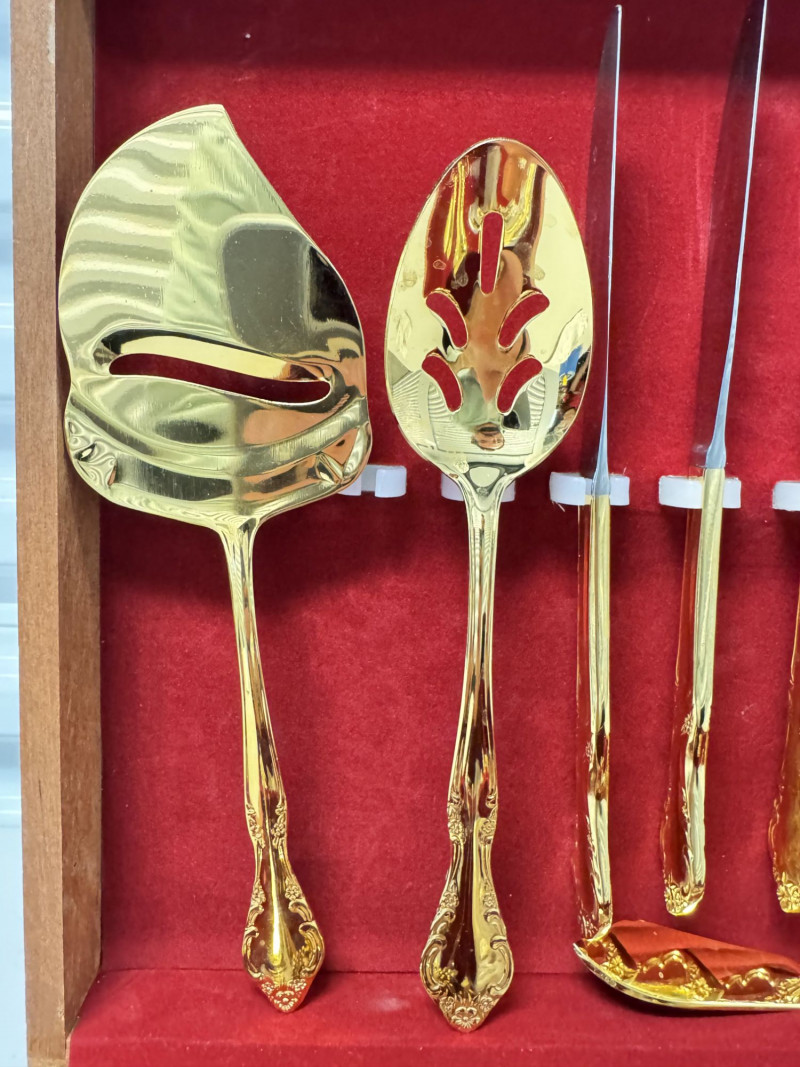 Gold Tone Flatware Set Marked G.P. Korea, In Wood Case - 62 Pcs.• Set Includes: