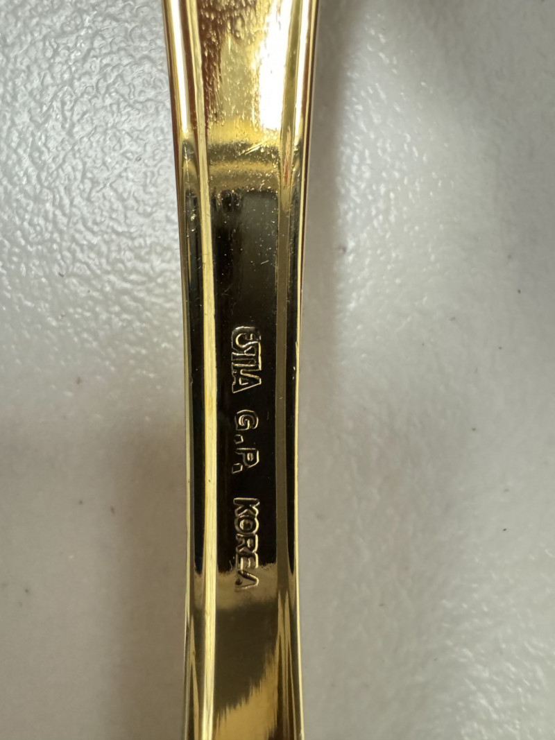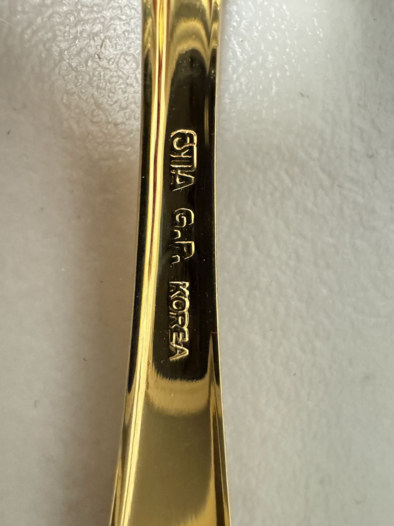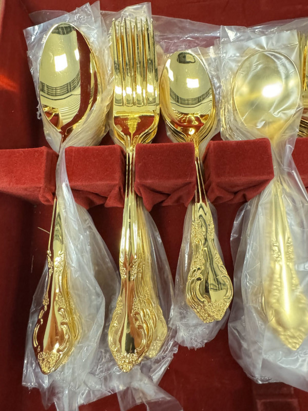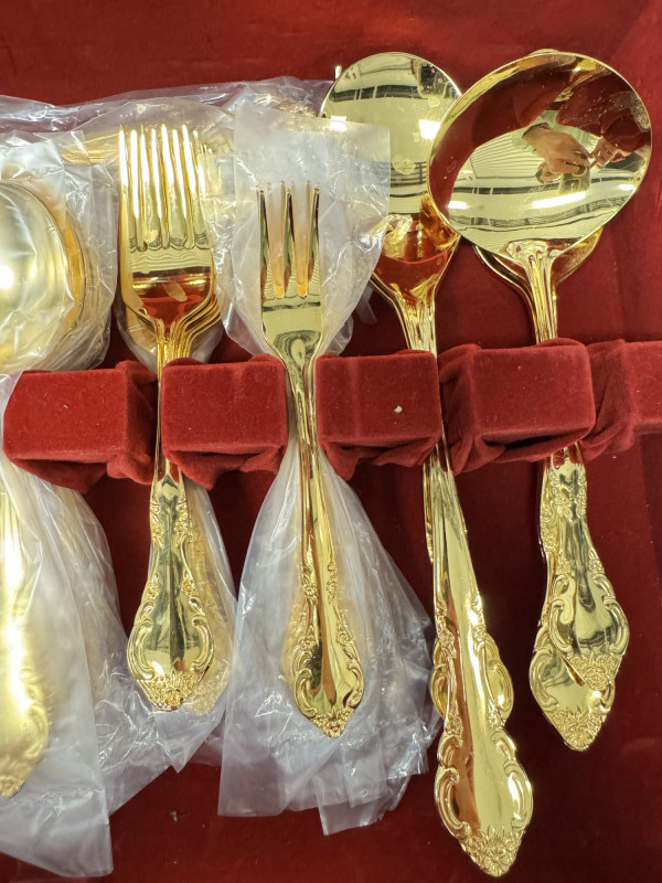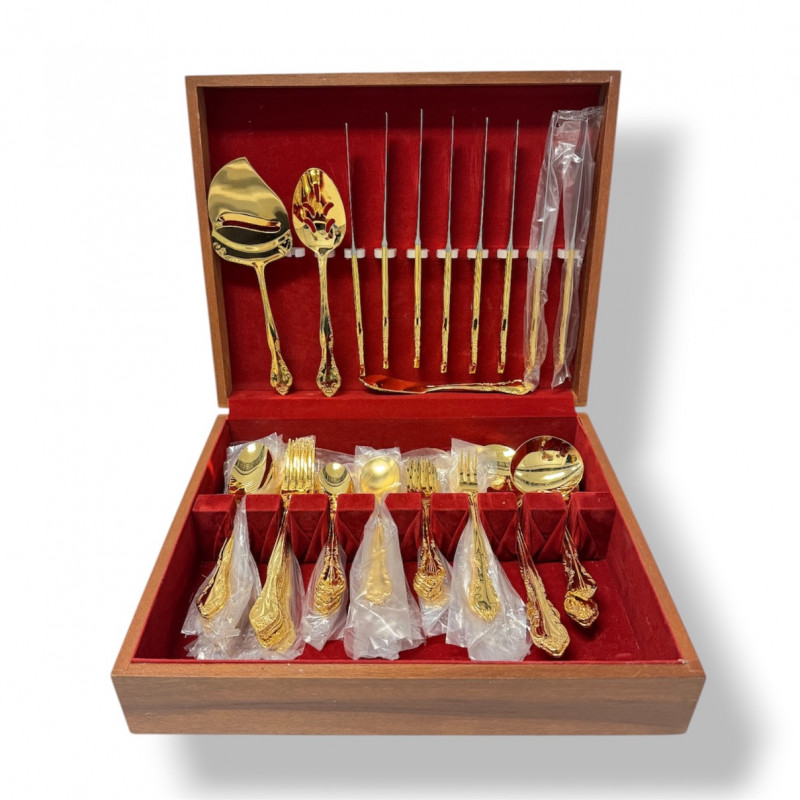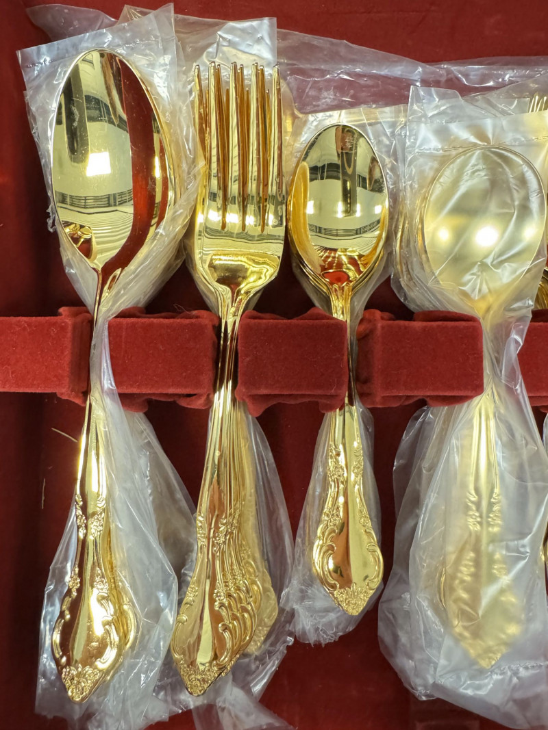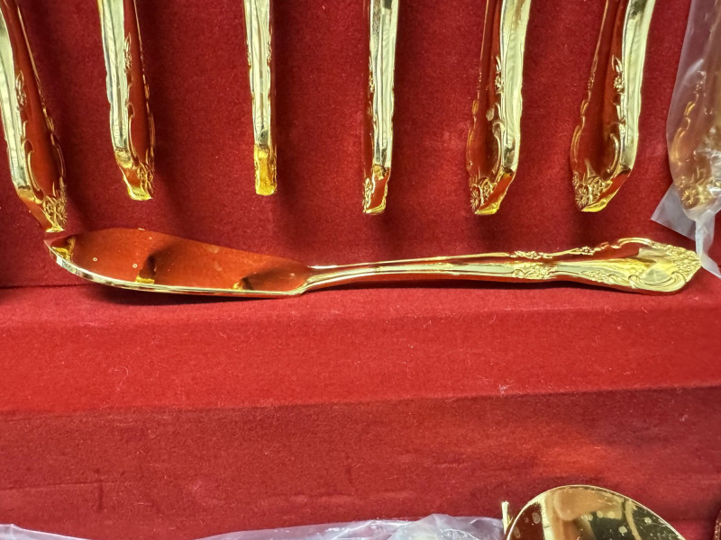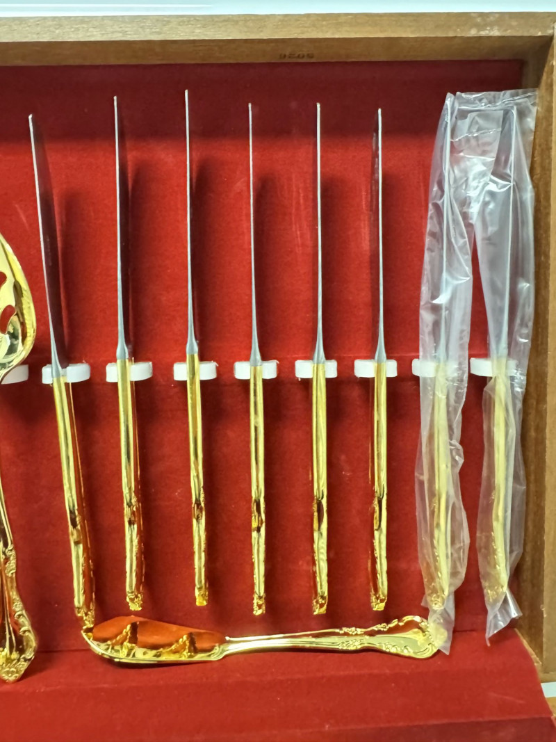 Gold Tone Flatware Set Marked G.P. Korea, In Wood Case - 62 Pcs.• Set Includes: